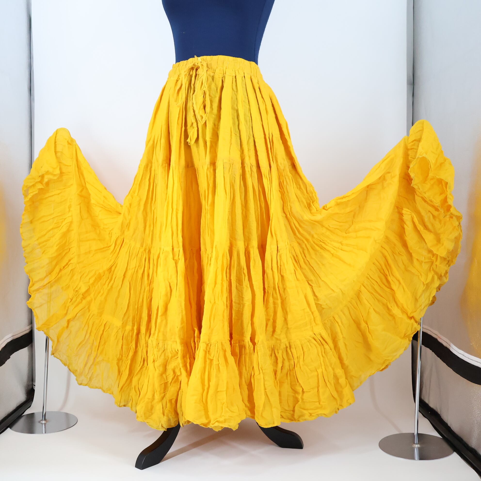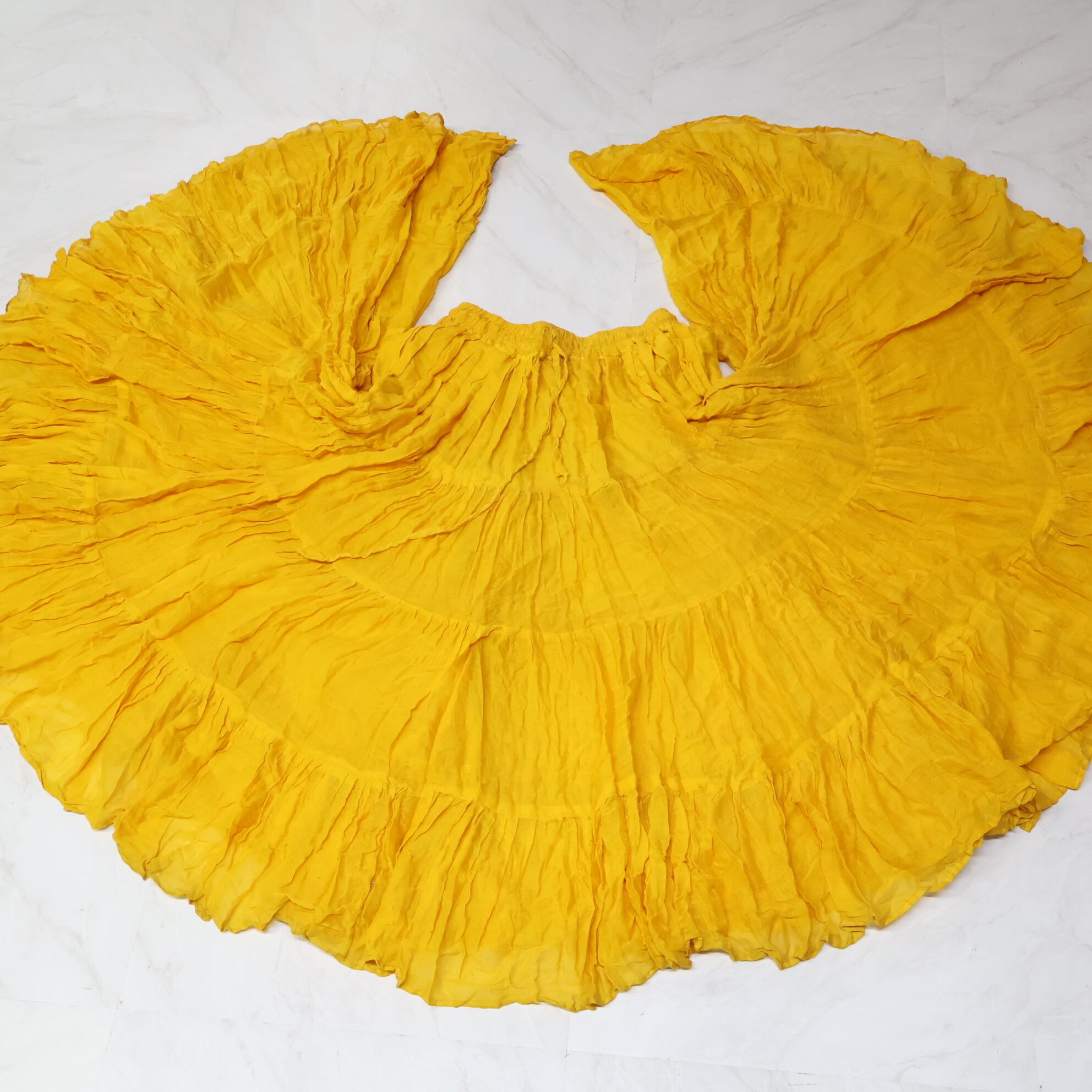 #ダンス衣装 #ダンスコスチューム #ステージ衣装 #古着 #中古 #ENUTSU #ベリーダンス衣装 #ジプシースカート #山吹色 #黄色衣装 #レース生地 #4段フリル #ボリュームスカート #無地デザイン #シンプル衣装 #鮮やか衣装 #ふんわり感 #ステージ映え #華やか衣装 #軽やかデザイン #お洒落スカート
