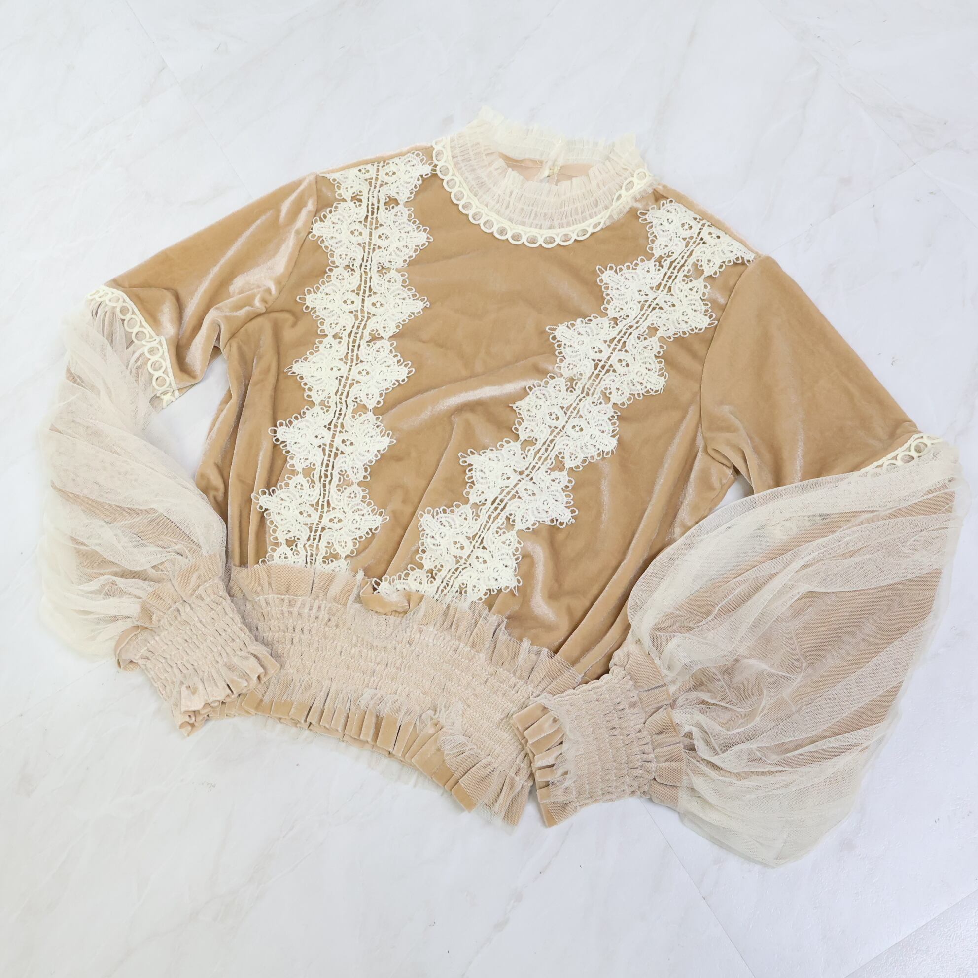 【美品 フラメンコ衣装】ブラウン トップス ブラウス 茶色 ホワイト 白 フリル レース 長袖 ベロア ベージュ アイボリー