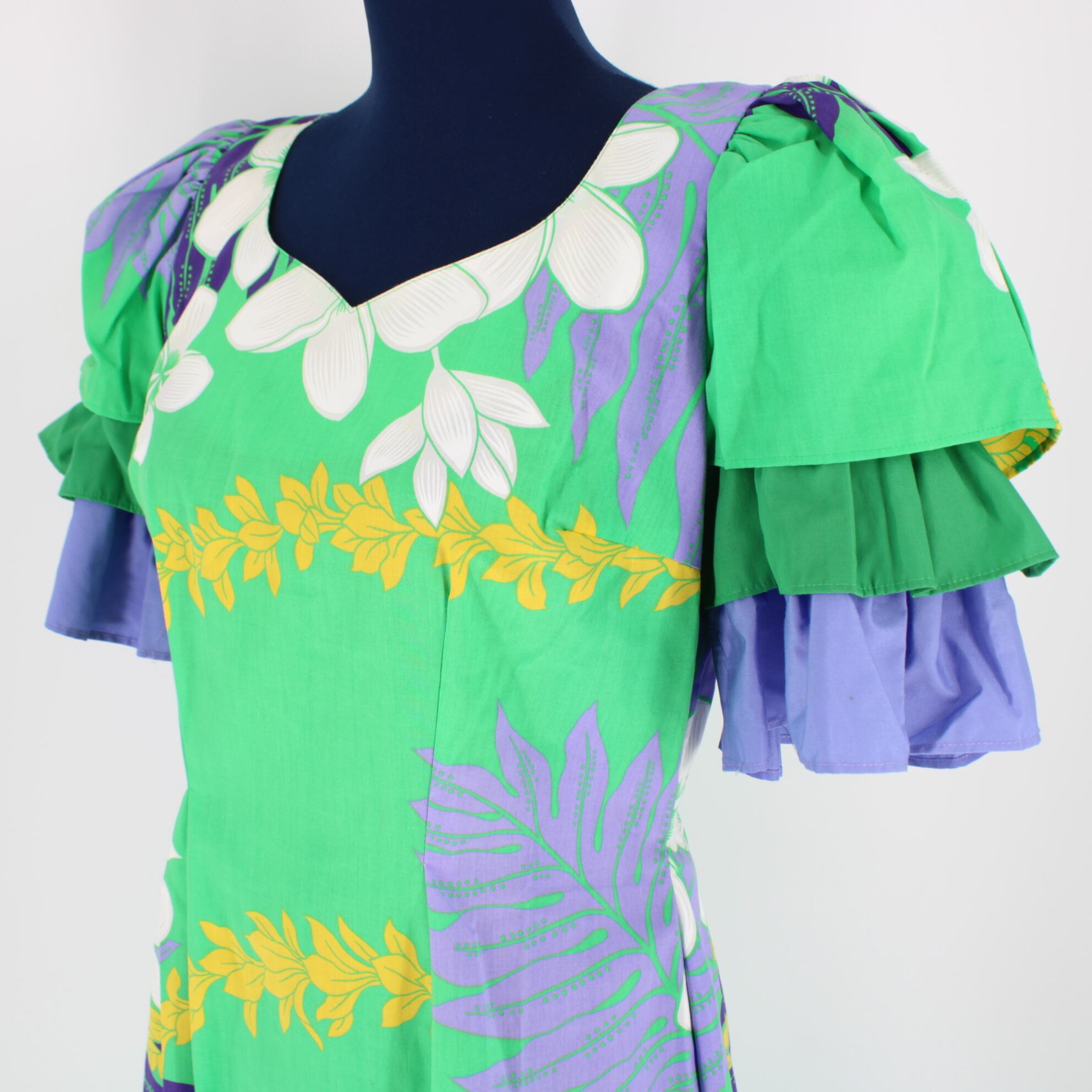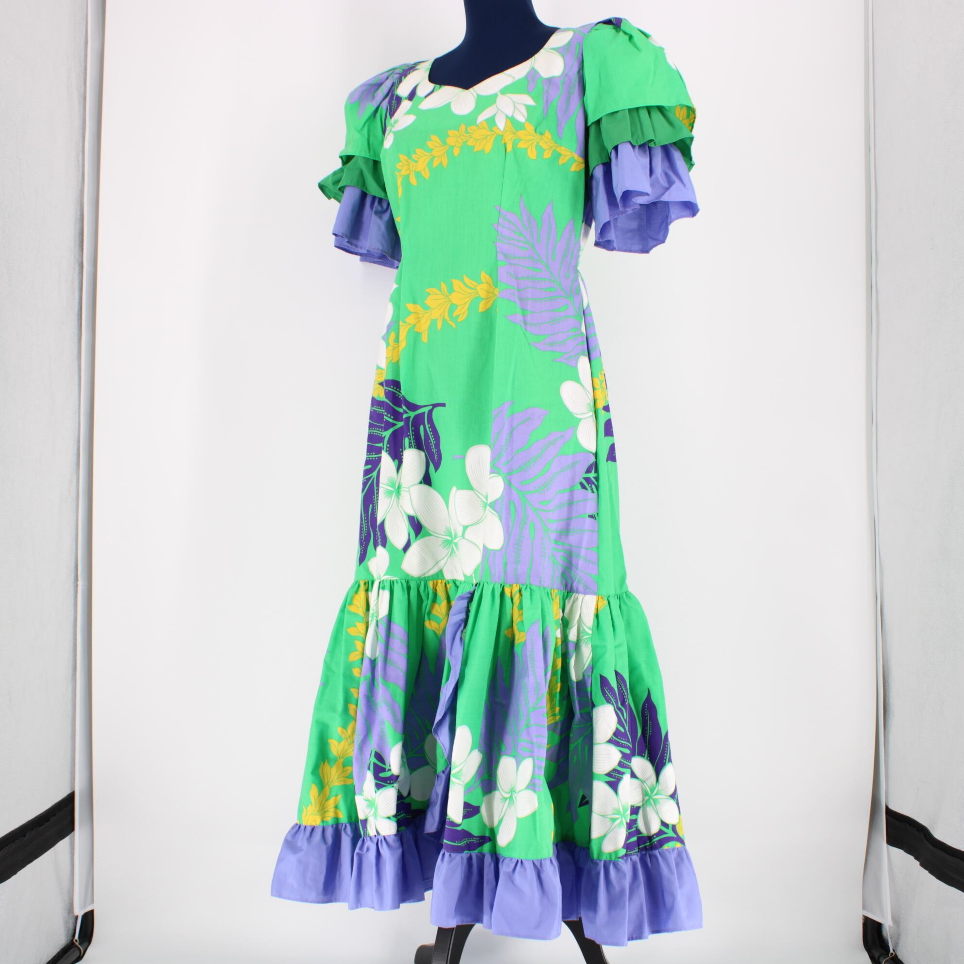 【美品 フラダンス衣装】グリーン FANCY DRESS ファンシードレス ワンピース ドレス 緑 紫 黄 半袖 フリル プルメリア柄 花柄