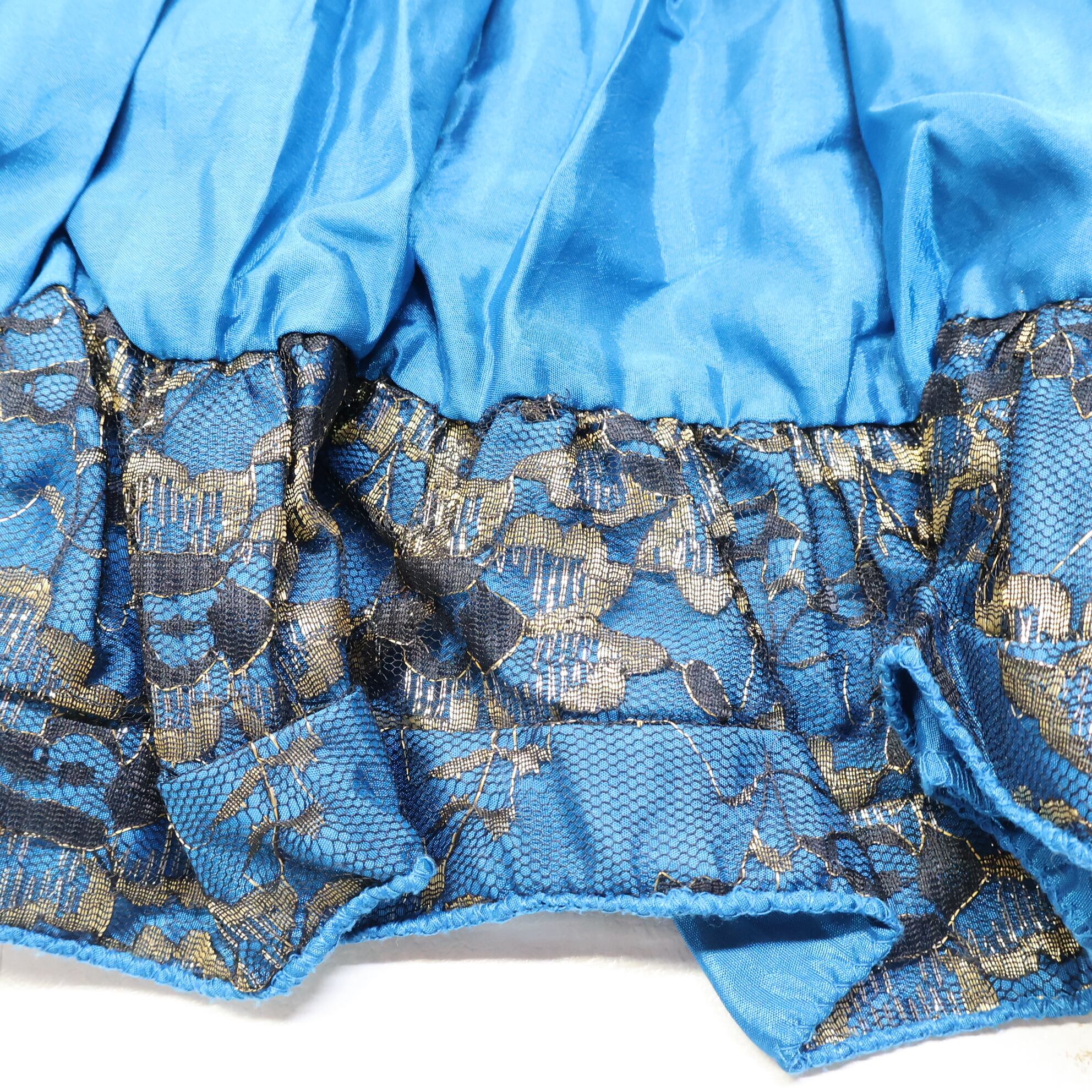 【インド製 ベリーダンス用衣装】水色×ゴールド ジプシースカート 黒 レース フリル 異国情緒 ロング 光沢 艶 ボリューム