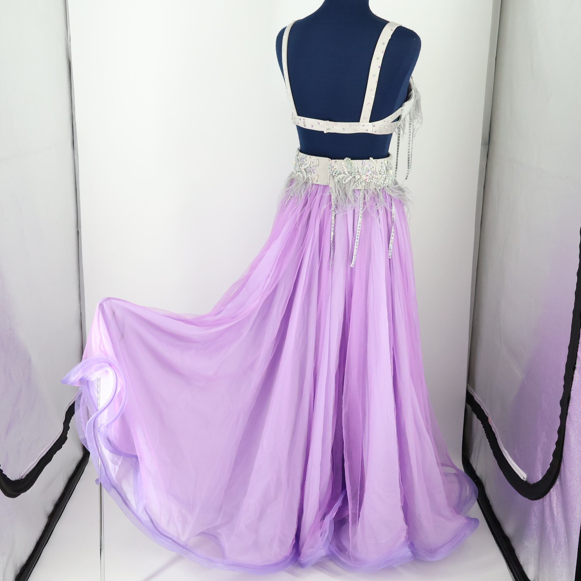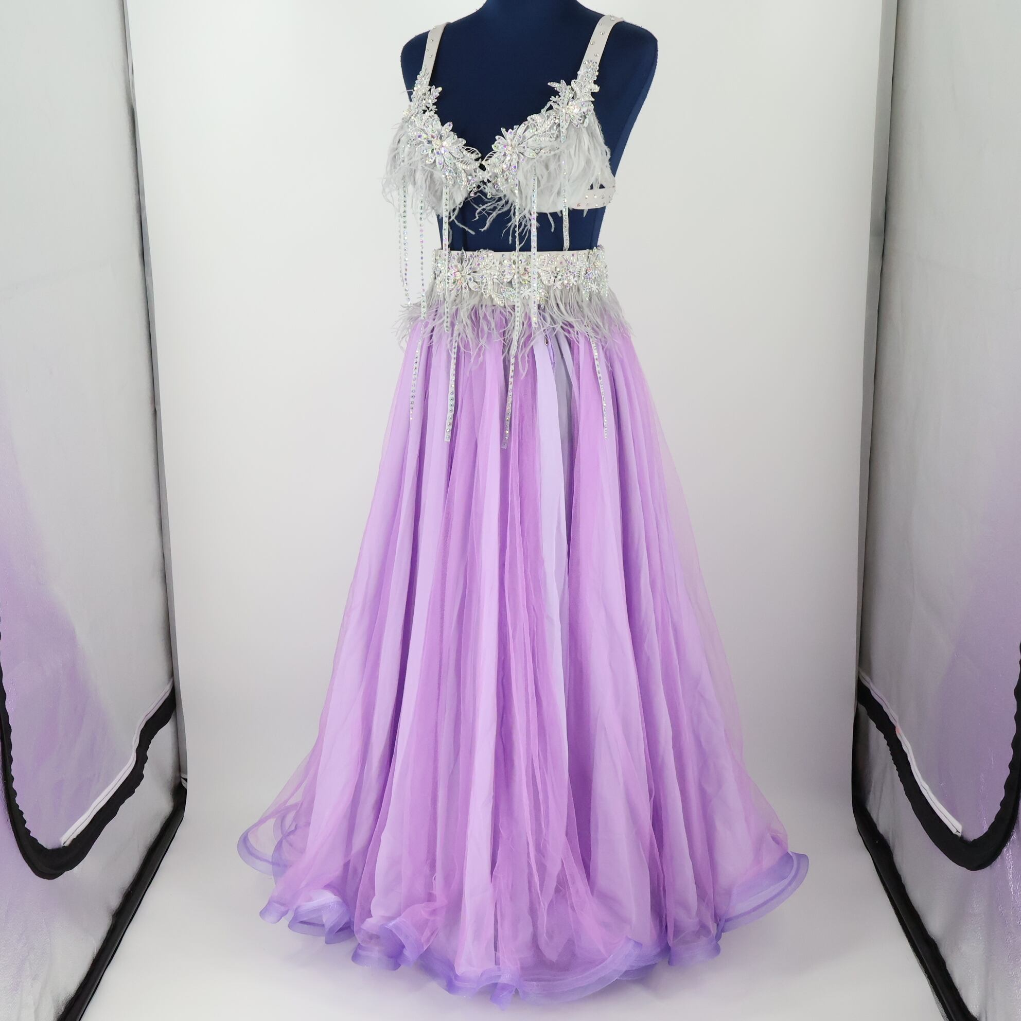 #ダンス衣装 #ダンスコスチューム #ステージ衣装 #古着 #中古 #ENUTSU #ベリーダンス衣装 #オリエンタルスタイル #紫衣装 #ラベンダーカラー #ラインストーン装飾 #羽モチーフ #花柄レース #パールディテール #煌びやか #女性らしいデザイン #華やか衣装 #豪華スタイル #ブラトップセット #スカートセット #ボリューム感 #ステージ映え