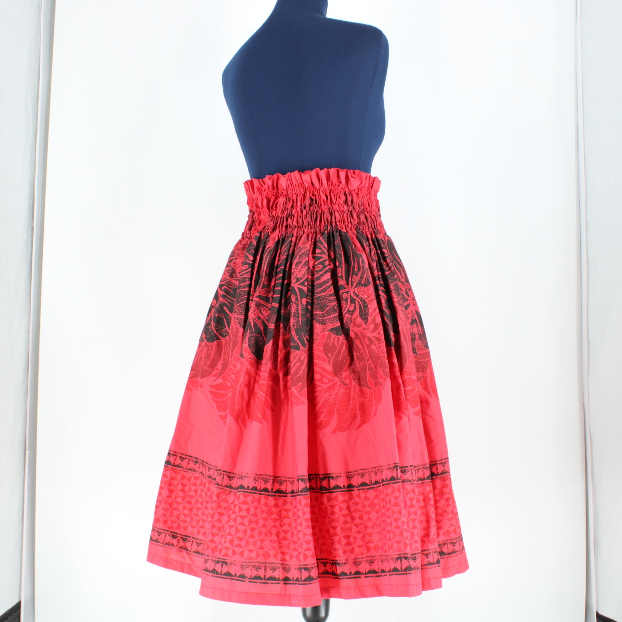 【フラダンス衣装】レッド パウスカート モンステラ柄 赤 黒 ブラック ハワイアンプリント シングル アロハ 鮮やか かわいい