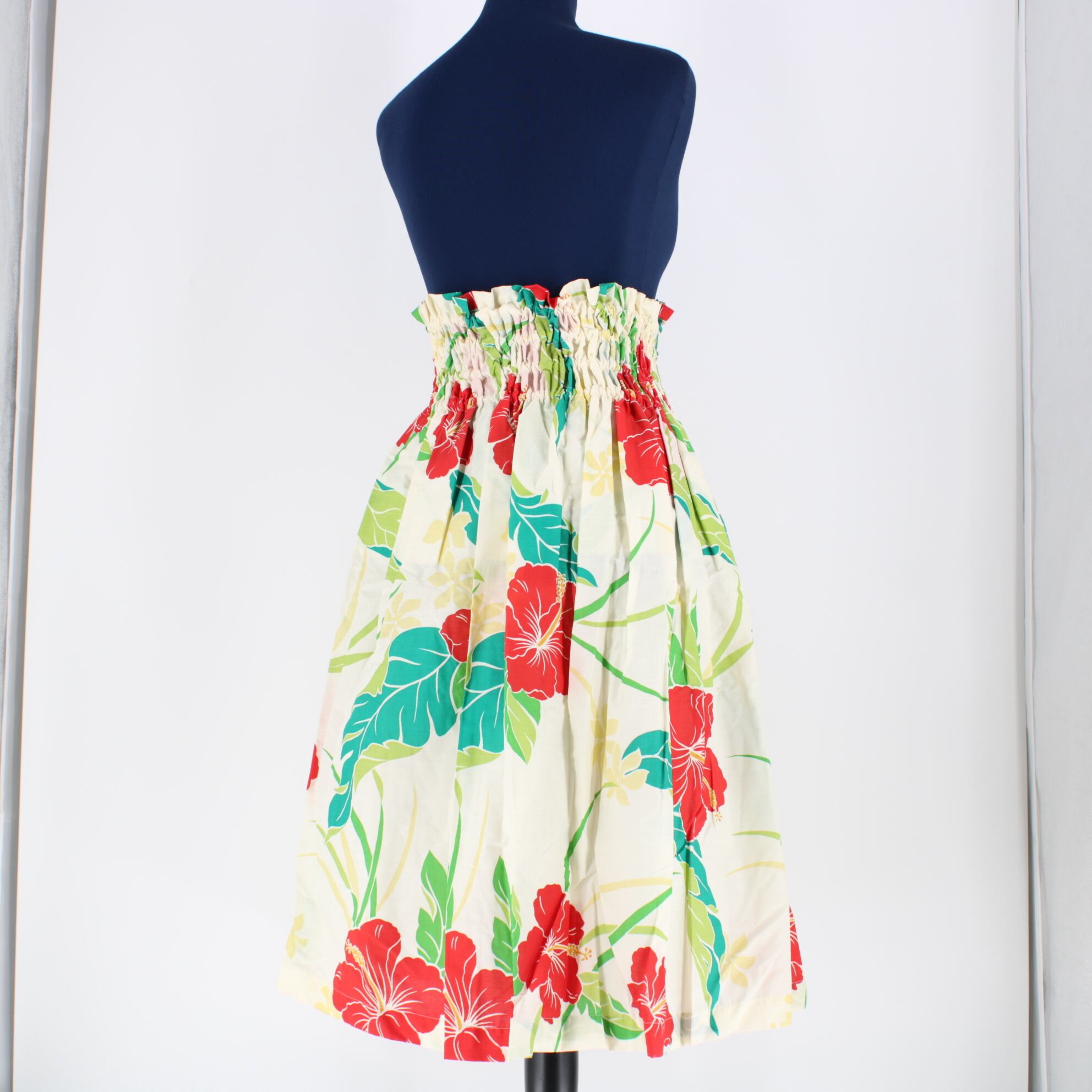 【フラダンス衣装】アイボリー パウスカート ハイビスカス柄 白 赤 レッド 華やか 鮮やか グリーン 緑 花柄 ティアレ柄 可愛い