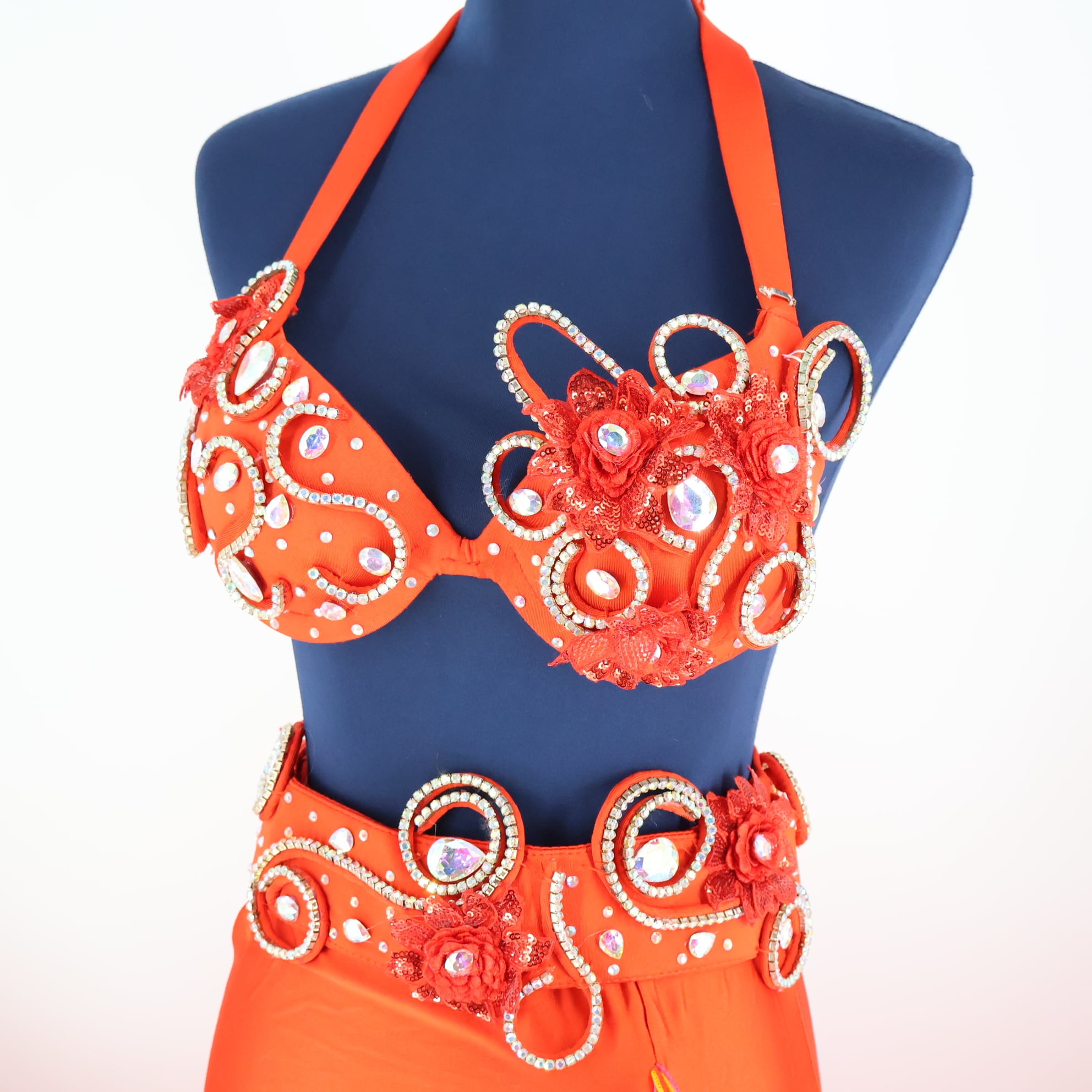 【ベリーダンス用 オリエンタル衣装】レッド ラインストーン 真っ赤 シルバー 花のコスチューム フリル 華やか レース 豪華 鮮やか 煌びやか ボリューム 女性らしい スリット入り ブラトップ ベルト スカートセット