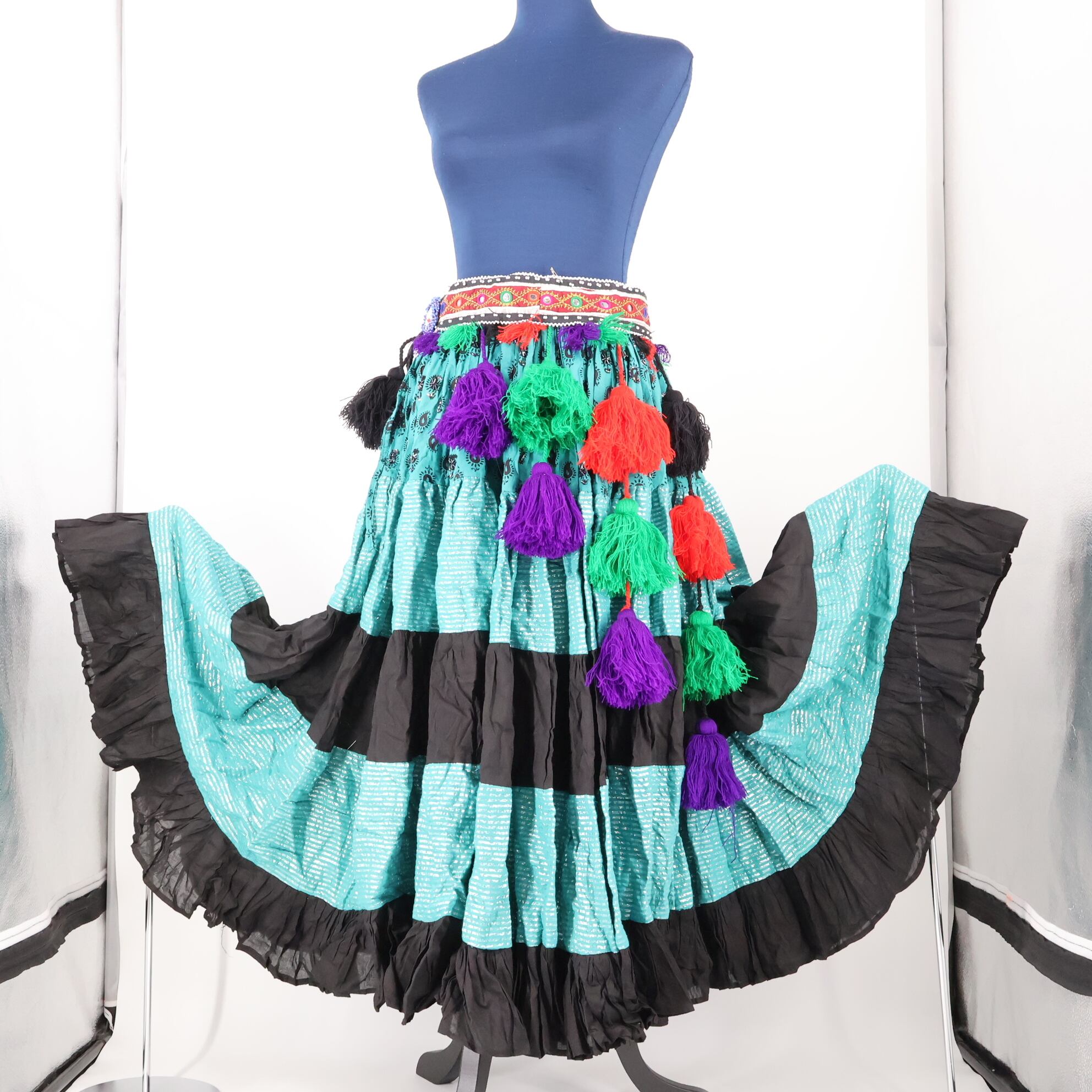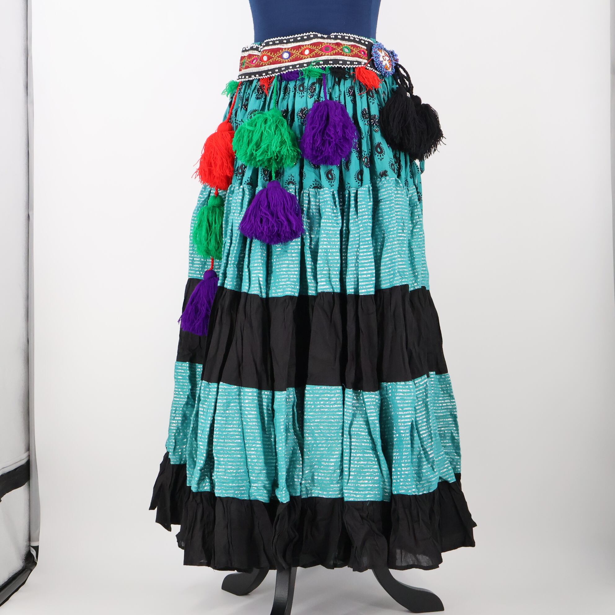 【インド製 ベリーダンス用衣装】水色×ブラック eden ジプシースカート 黒 カラフル ロング ラメ ベルト ボリューム 異国情緒 お洒落 華やか ボーダー