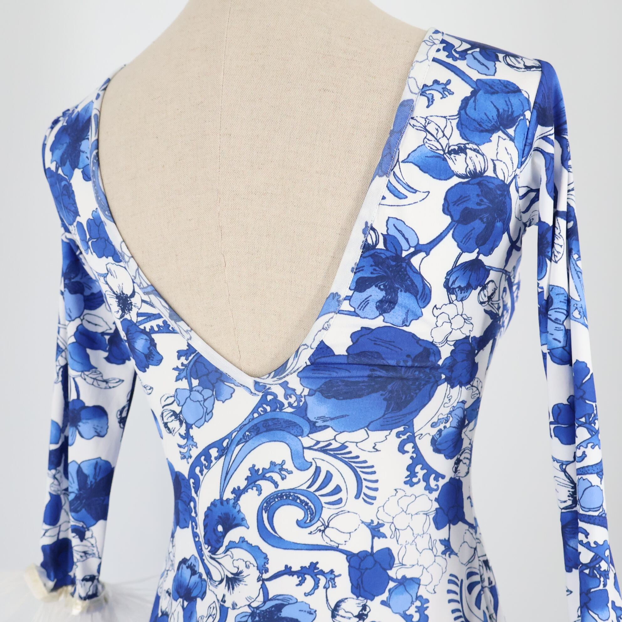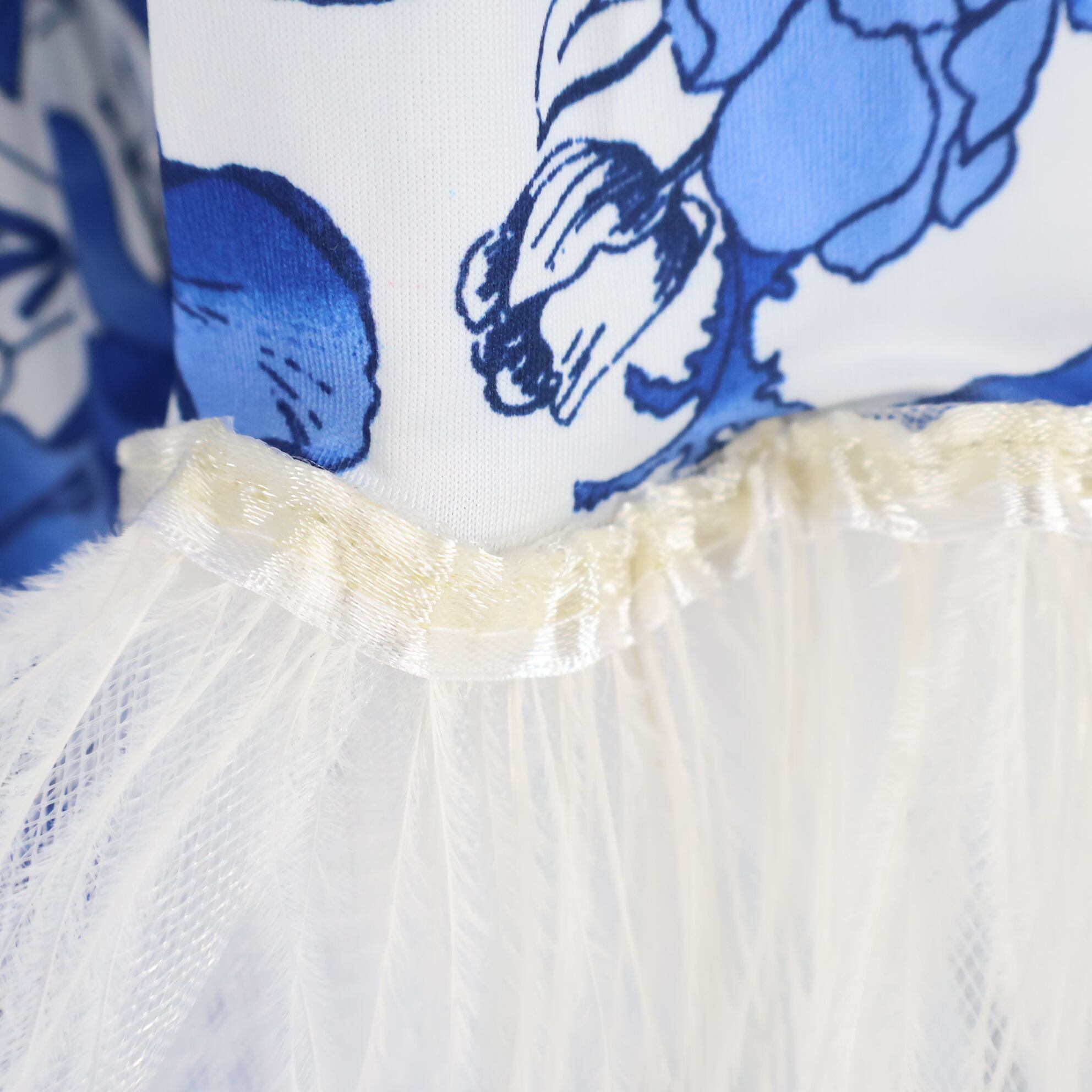 【美品 社交ダンス衣装】ブルー ワンピース ドレス ファー 青 ホワイト 白 花柄 フリル レース 高級感 上品 デモ 発表会