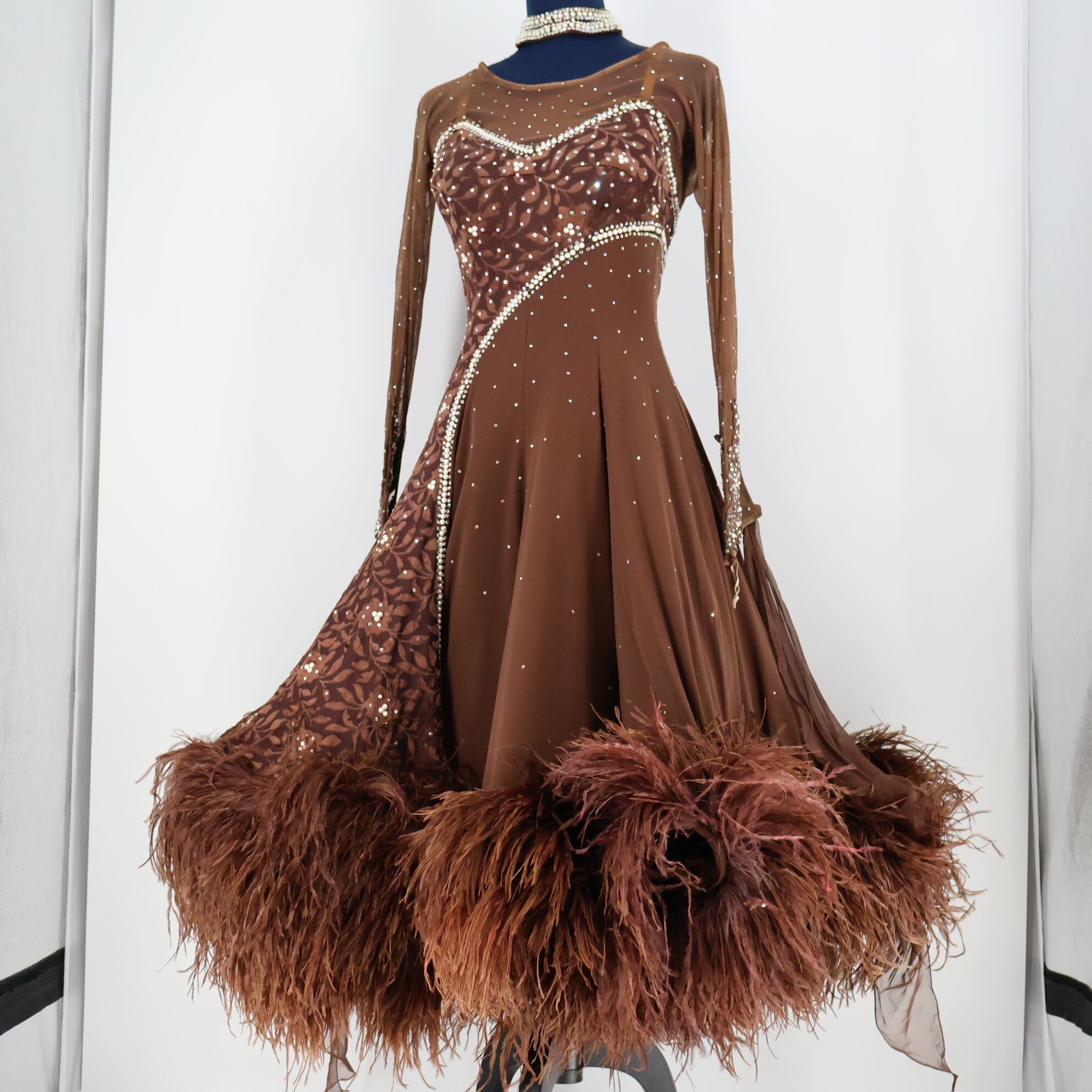 #社交ダンス #ダンス衣装 #ワンピース #ドレス #ファー #ベロア #ベルベット #ブラウン #茶色 #焦げ茶色 #デモ #競技用 #ダンス用 #レディース #チョーカー #ビーズ #ビジュー #羽 #長袖 #コスチューム #ダンスコスチューム