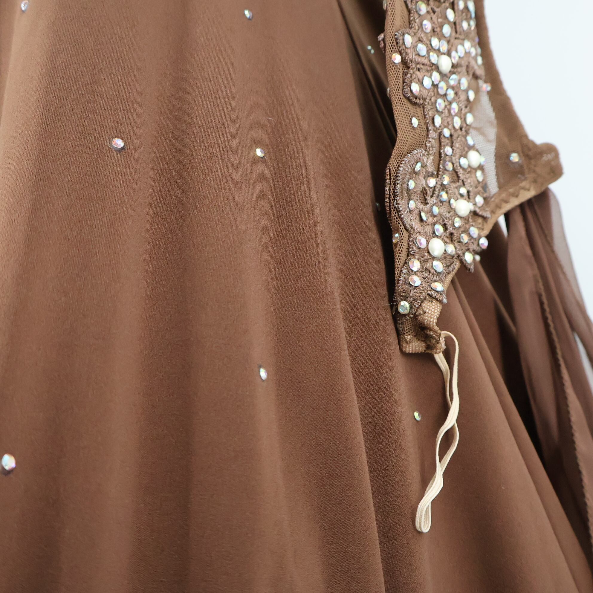 【イングランド製 社交ダンス衣装】ブラウン ワンピース ドレス ファー フロート ベロア ベルベット 茶色 焦げ茶色 デモ 競技用 ダンス用 レディース チョーカー ビーズ ビジュー 羽 長袖 コスチューム