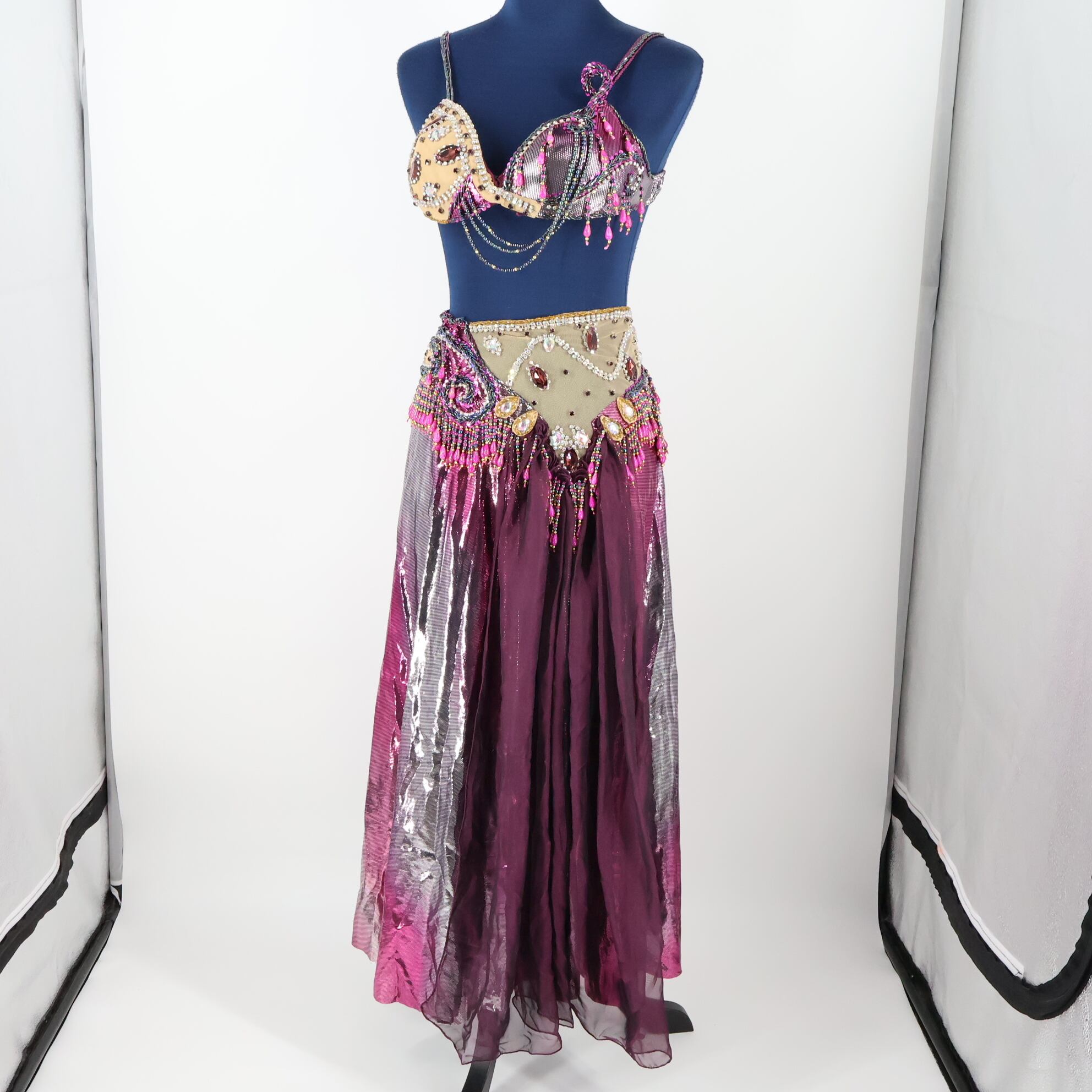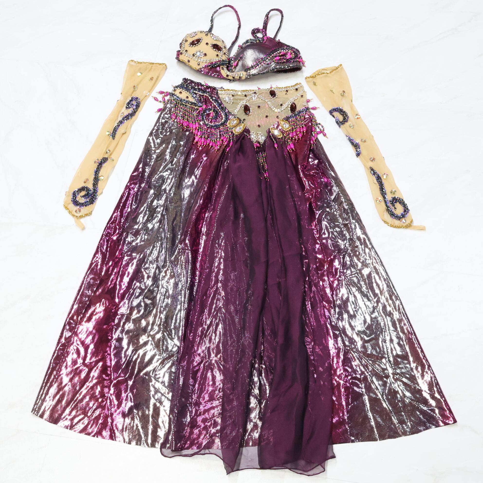 【ベリーダンス用 オリエンタル衣装】ワインレッド ラインストーン×ビーズ 豪華 紫 小豆色 ピンク シルバー 光沢 艶 華やか 煌びやか ラメ 落ち着いた色合い ブラトップ スカート アクセサリーセット
