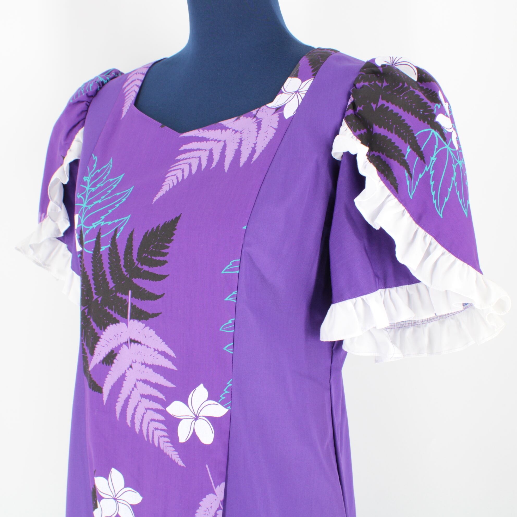 【美品 フラダンス衣装】パープル MAHALO マハロ ワンピース ドレス プルメリア柄 紫 ホワイト 白 フリル 華やか 鮮やか 花柄