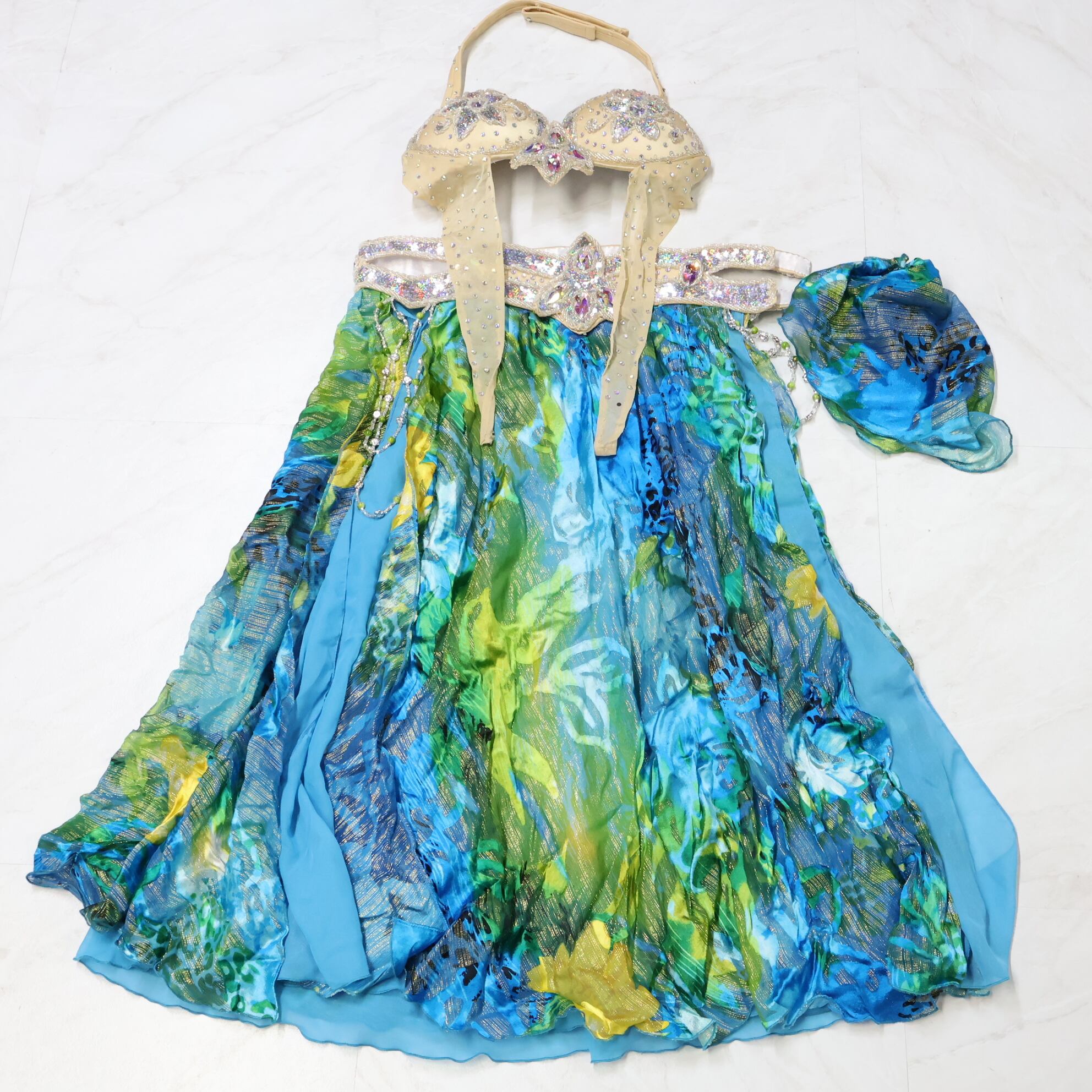 #ダンス衣装 #ダンスコスチューム #ステージ衣装 #古着 #中古 #ENUTSU #ベリーダンス #オリエンタル衣装 #水色コスチューム #黄緑アクセント #シルバー装飾 #豪華デザイン #花柄レース #フリルたっぷり #爽やかカラー #煌びやか #エレガント衣装 #ブラトップセット #スカートセット #アクセサリー付き #ステージ映え