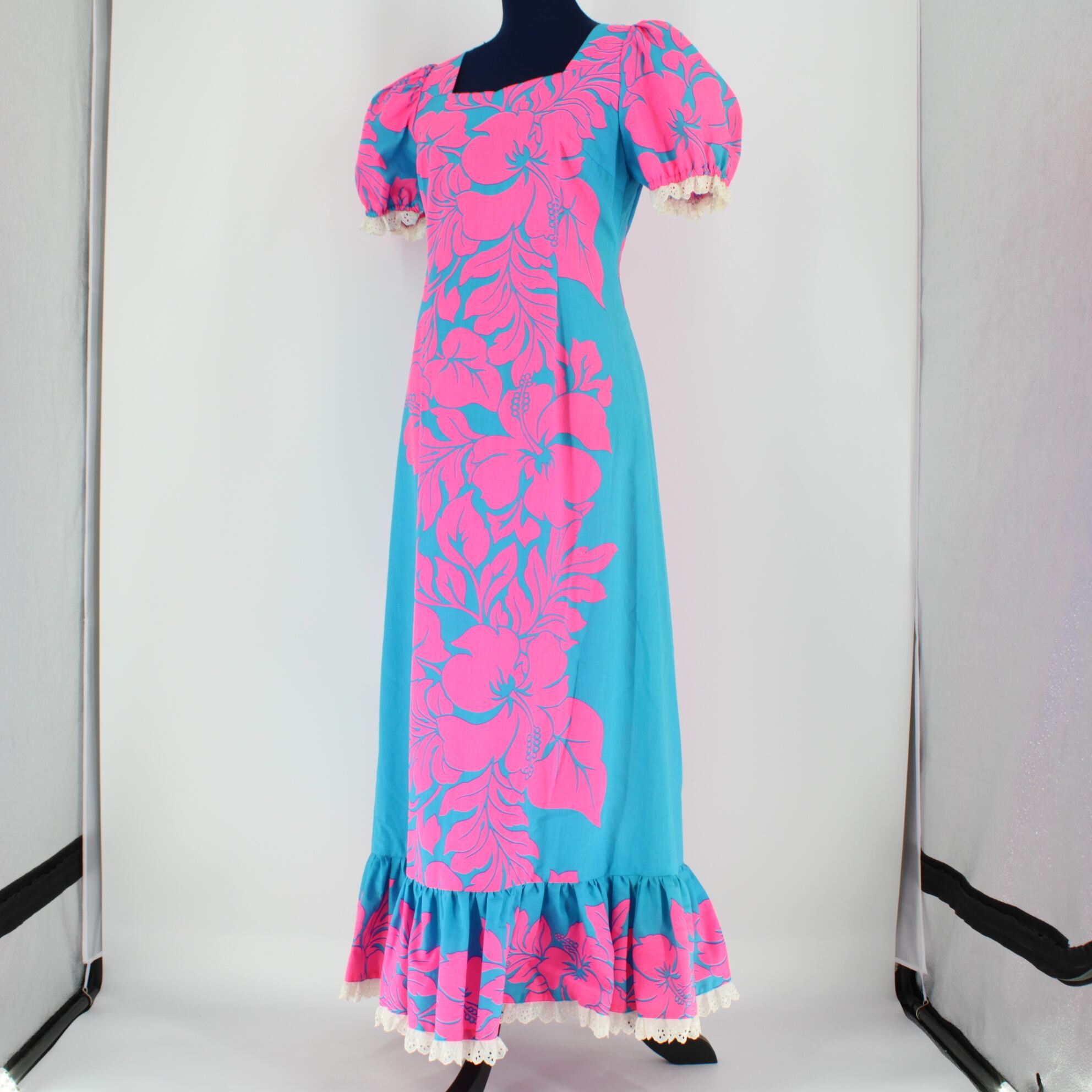 【フラダンス衣装】スカイブルー MAHALO マハロ ワンピース ドレス ハイビスカス柄 ピンク 水色 フリル レース 蛍光 かわいい