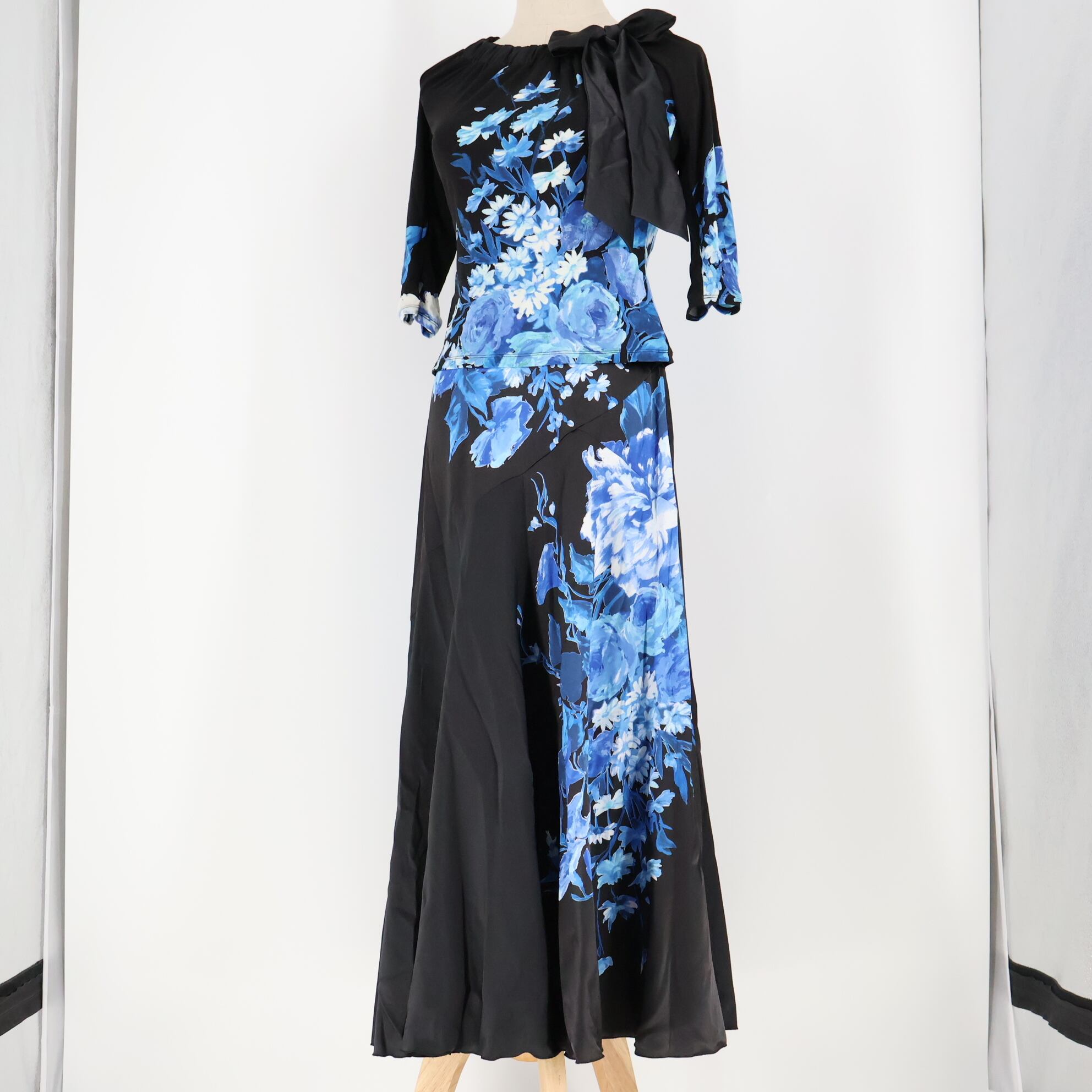 【美品 社交ダンス衣装】ブラック Chacott チャコット 上下セット ツーピース 青 花柄 黒 ブルー リボン 上品 高級感 光沢