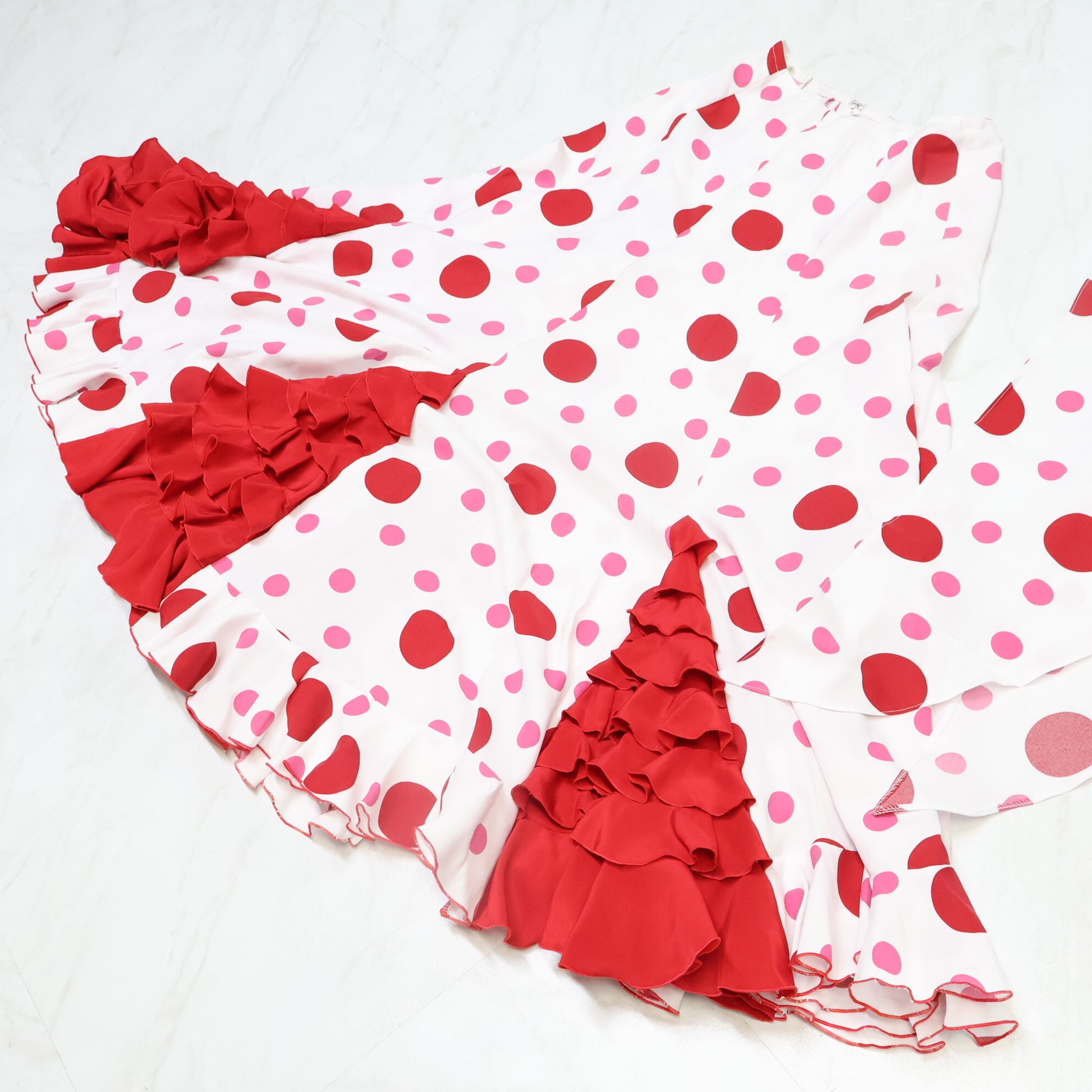 【フラメンコ衣装】ホワイト ファルダ スカート ボランテ 水玉 赤 ピンク ドット フリル シージョ 白 ダンス用 豪華 華やか