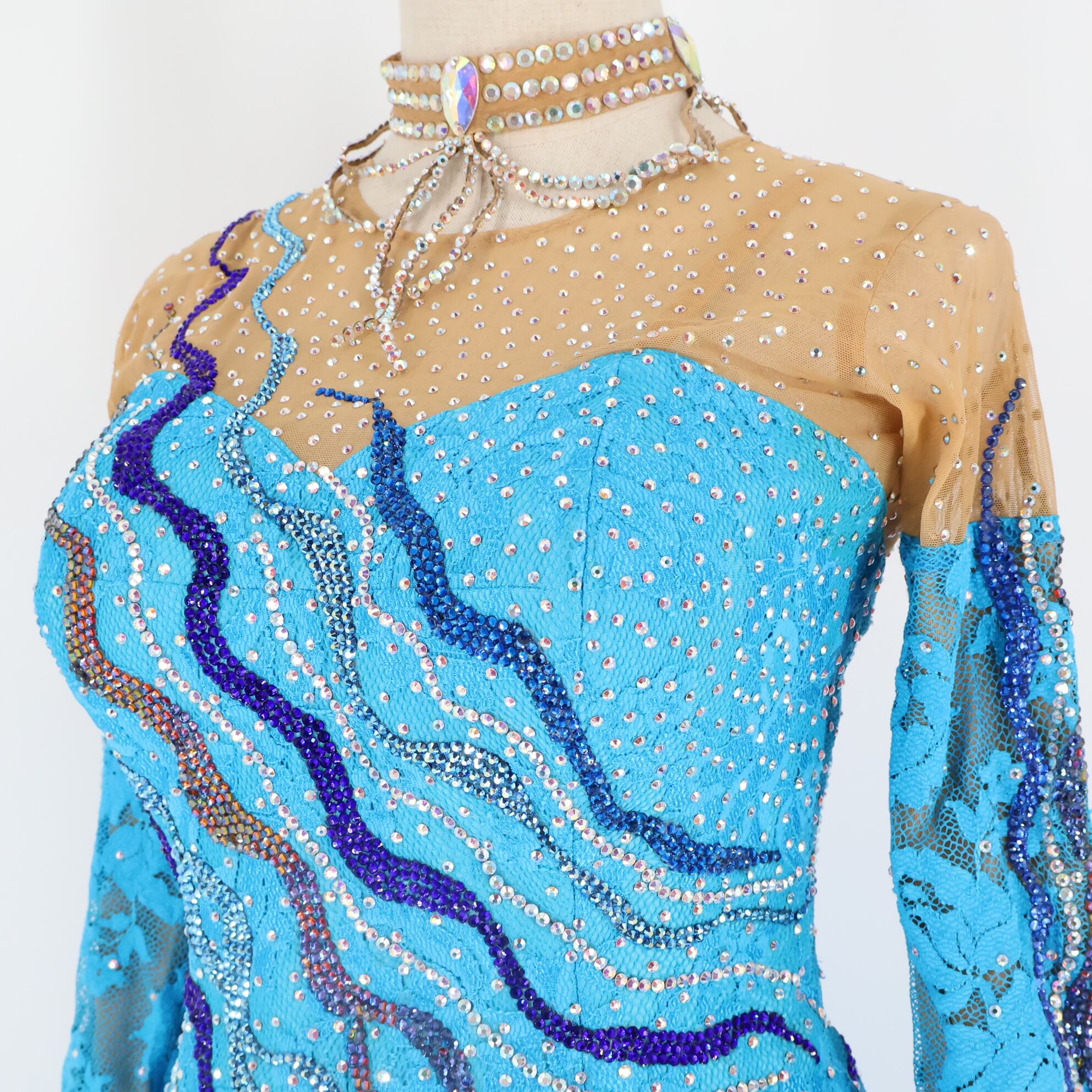 【社交ダンス衣装】ブルー アトリエjyojyo ワンピース ドレス 水色 青 フリル レース グラデーション デモ 競技用 ビーズ クロッチ 長袖 ダンス用 パーティ 発表会 レディース コスチューム 白 ビジュー ラインストーン