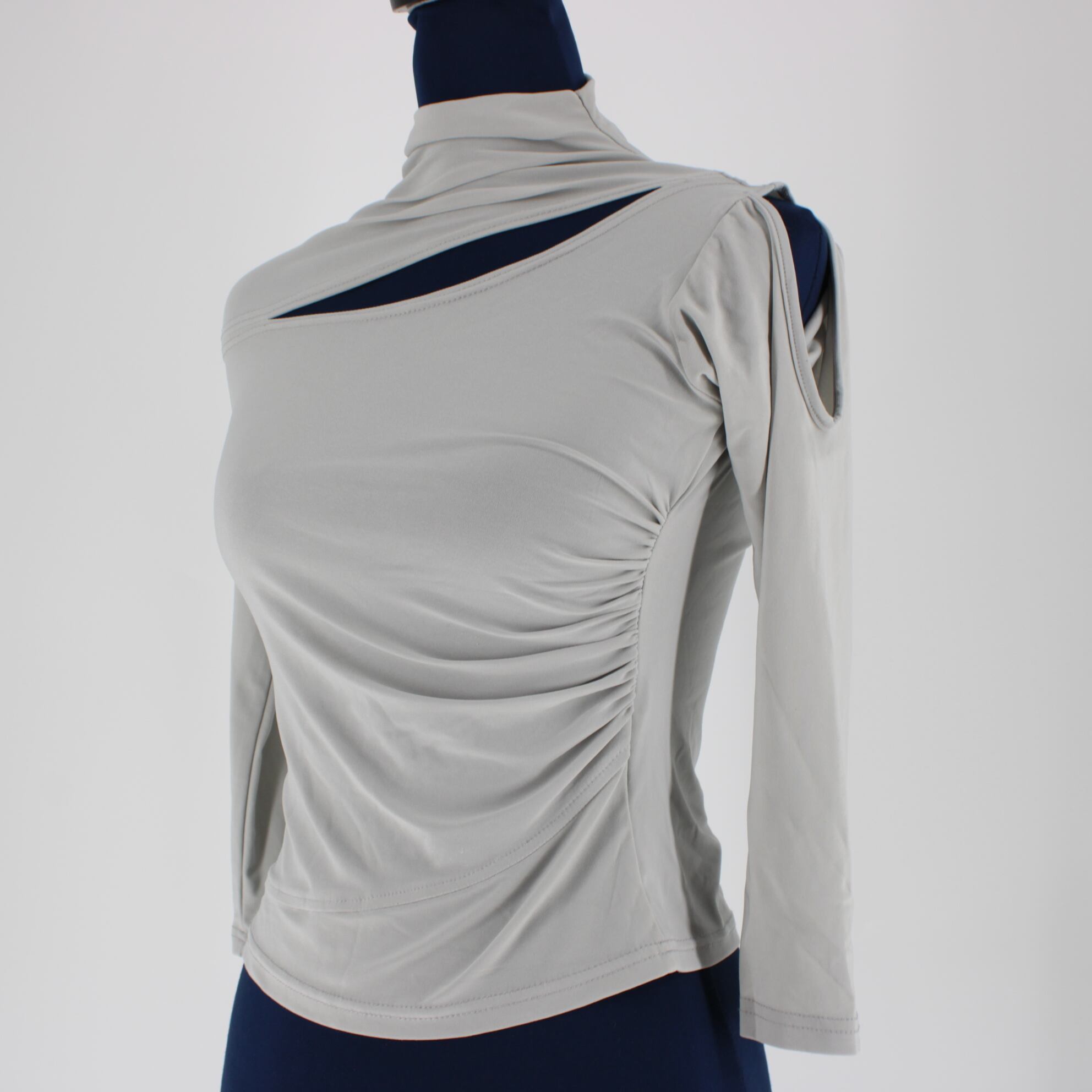 【美品 社交ダンス衣装】トップス create-sun ライトグレー Mサイズ 無地 シンプル かわいい 可愛い 上品 気品 アシンメトリー