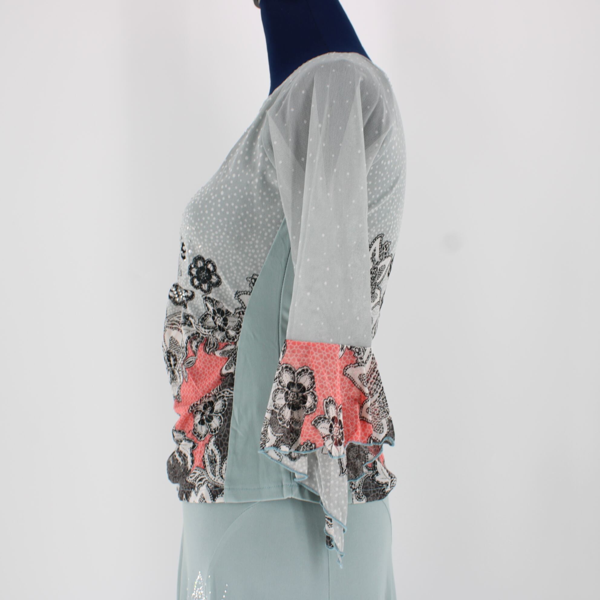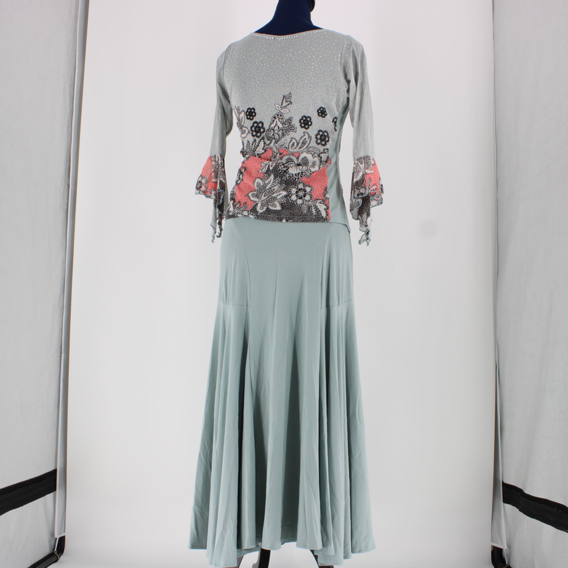 【美品 社交ダンス衣装】上下セット トップス スカート SICO-PON ライトグレー アイスグレー 花柄 ラインストーン 清楚 上品