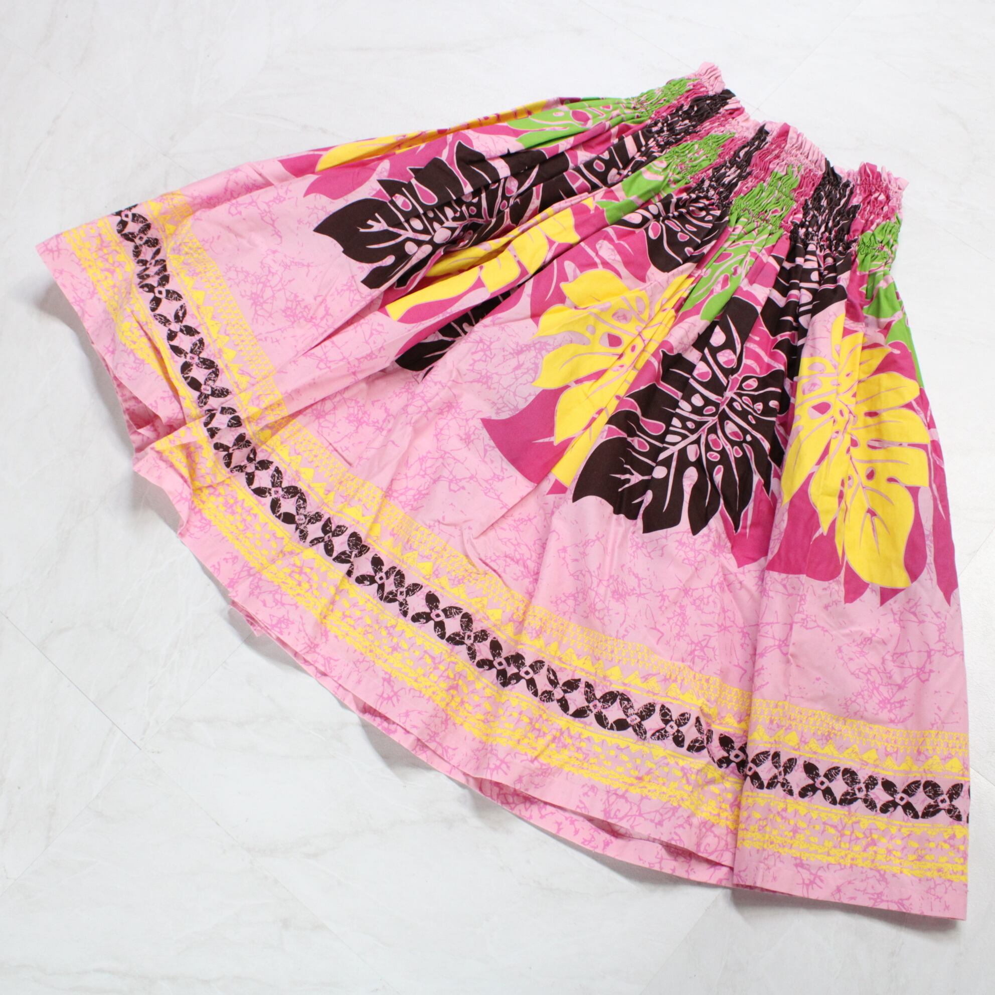 【日本製 フラダンス衣装】ピンク Paondor パンドール パウスカート モンステラ柄 華やか 鮮やか 茶 ブラウン 黄 黄緑 可愛い
