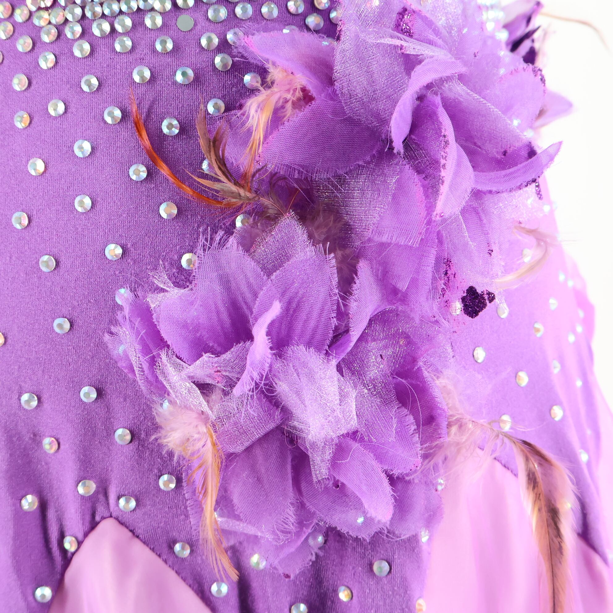 【社交ダンス衣装】パープル ワンピース ドレス 紫 フロート 花 フリル レース 高級感 ラベンダー 藤色 ビジュー 豪華 デモ 競技用 レディース レオタード クロッチ 羽 装飾 チョーカー ダンス用