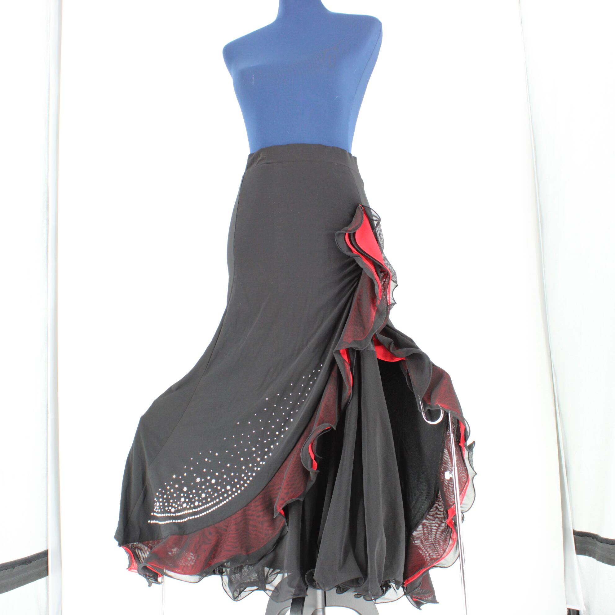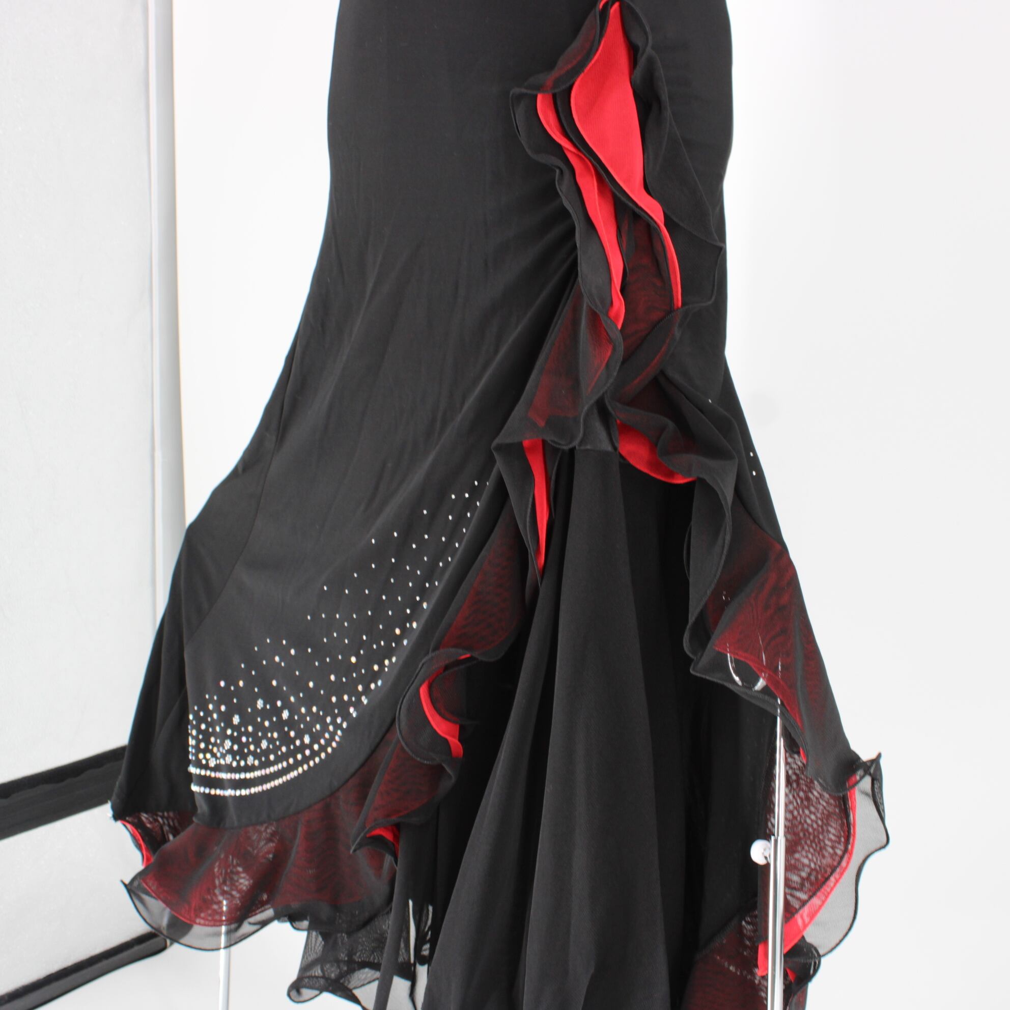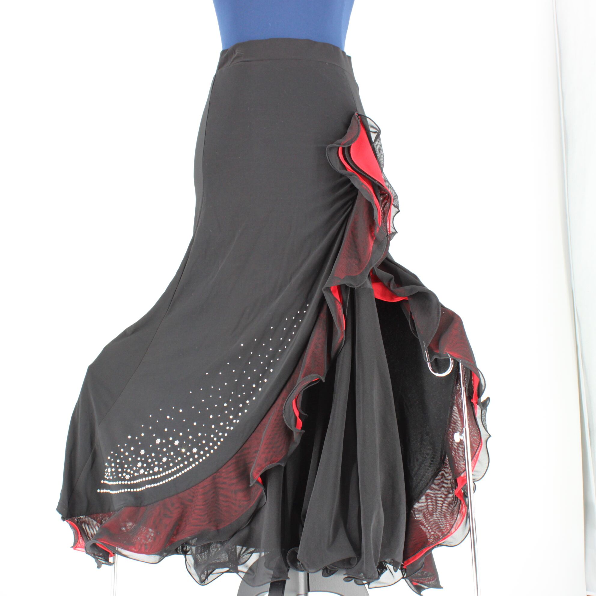 【社交ダンス衣装】スカート ブラック 赤 黒 ブラック レッド ラインストーン バイカラー アシンメトリー フリル 上品