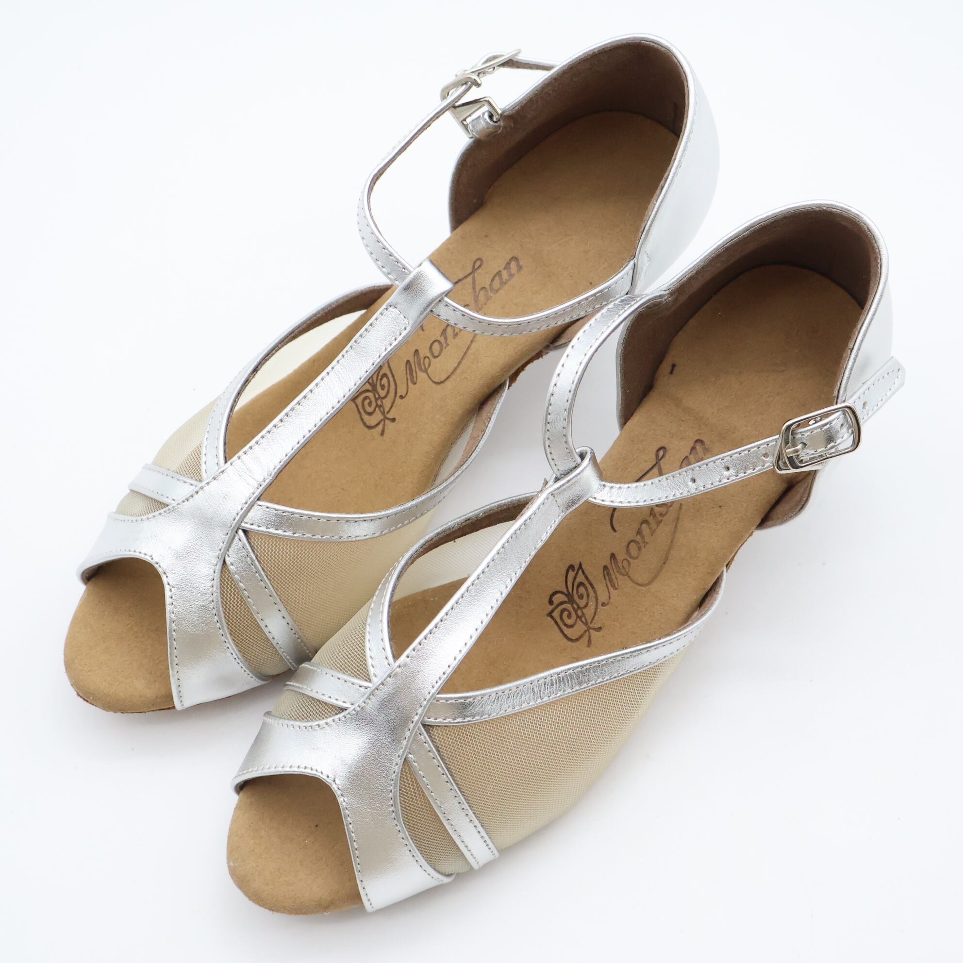 【社交ダンス用衣装】22CM Monishan モニシャン シルバー ダンス シューズ レディース用 メッシュ 光沢 女性用 靴 ヒール 紐