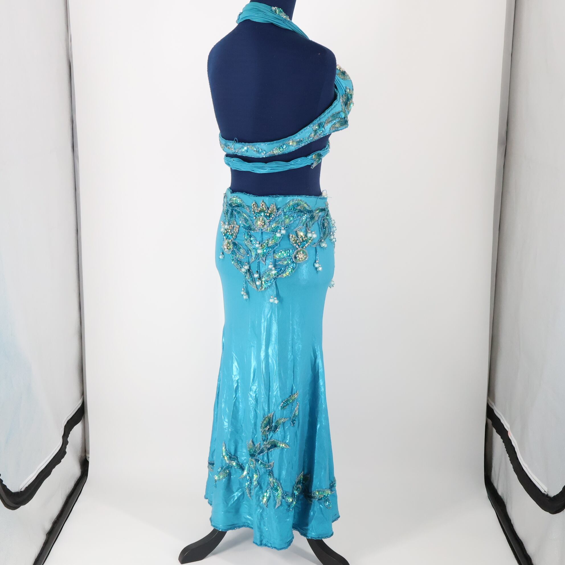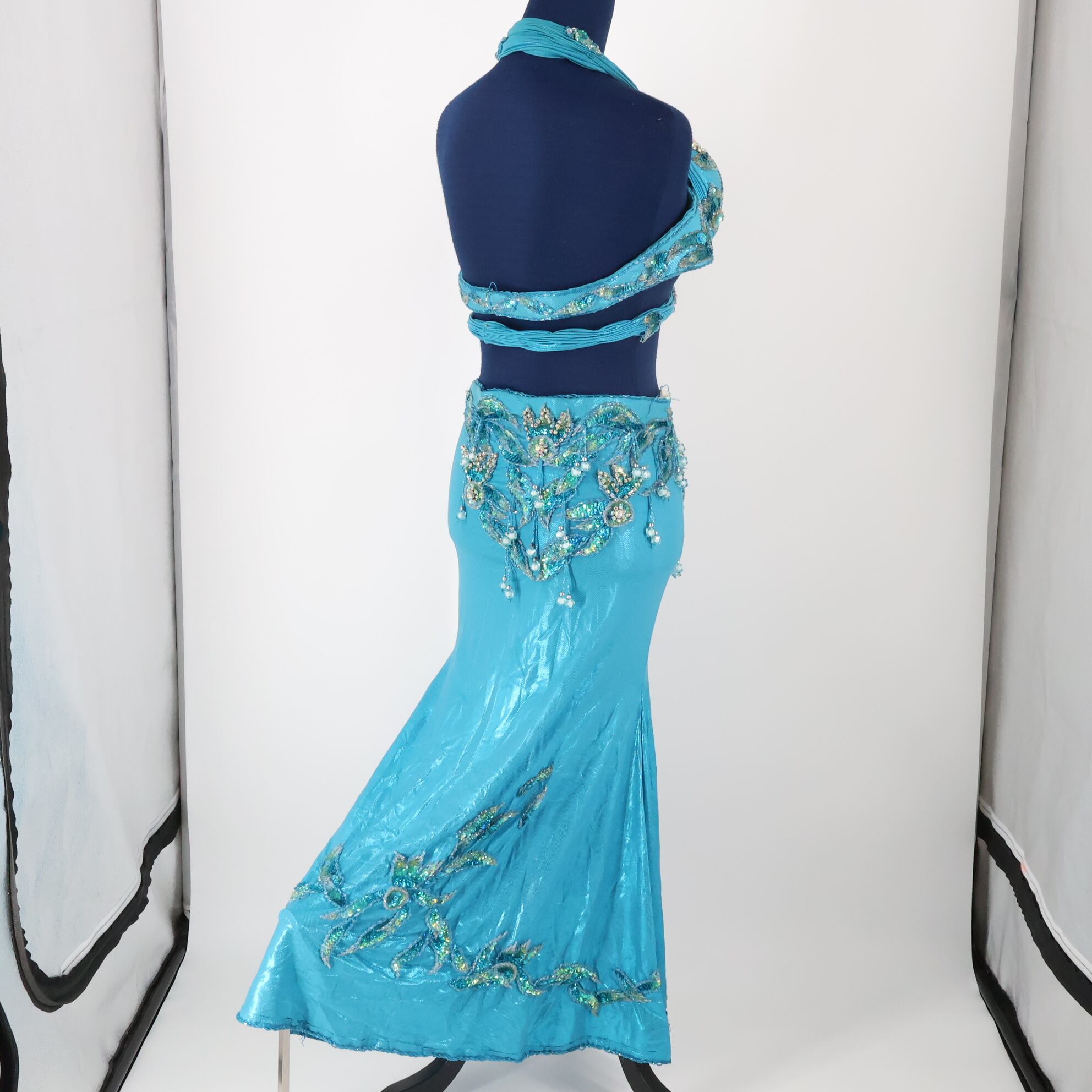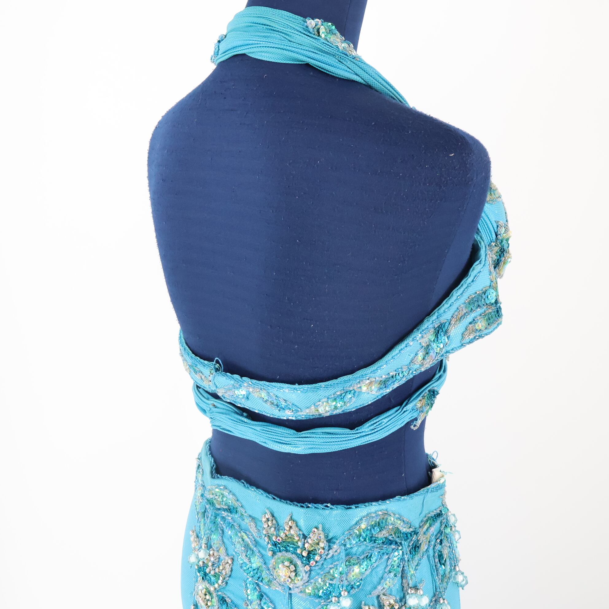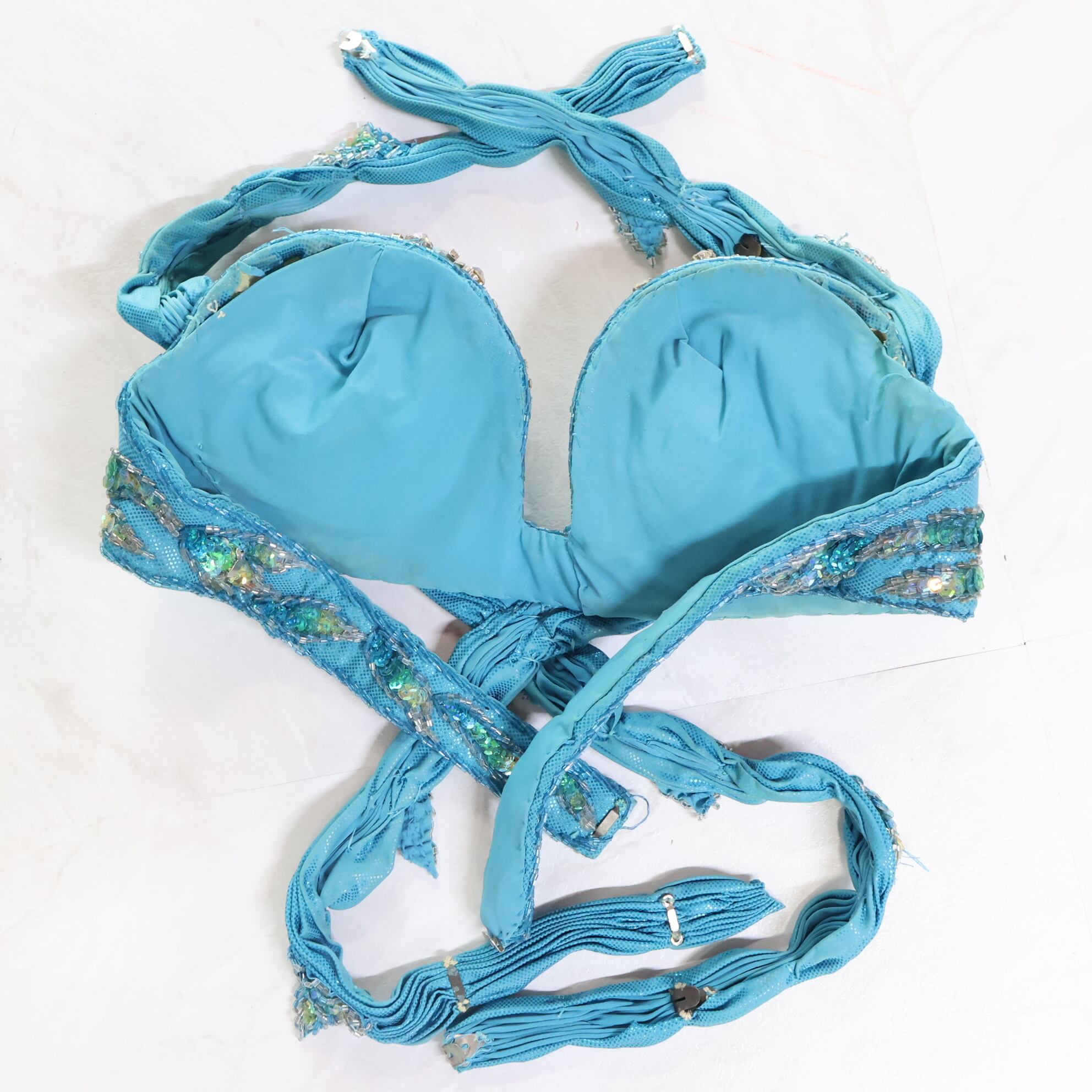 #ダンス衣装 #ダンスコスチューム #ステージ衣装 #古着 #中古 #ENUTSU #ベリーダンス #オリエンタル衣装 #ブラトップ #スカートセット #水色 #グラデーション #シルバー #スパンコール #ビーズ装飾 #ラインストーン #煌びやか #豪華デザイン #爽やか #セクシー #光沢感