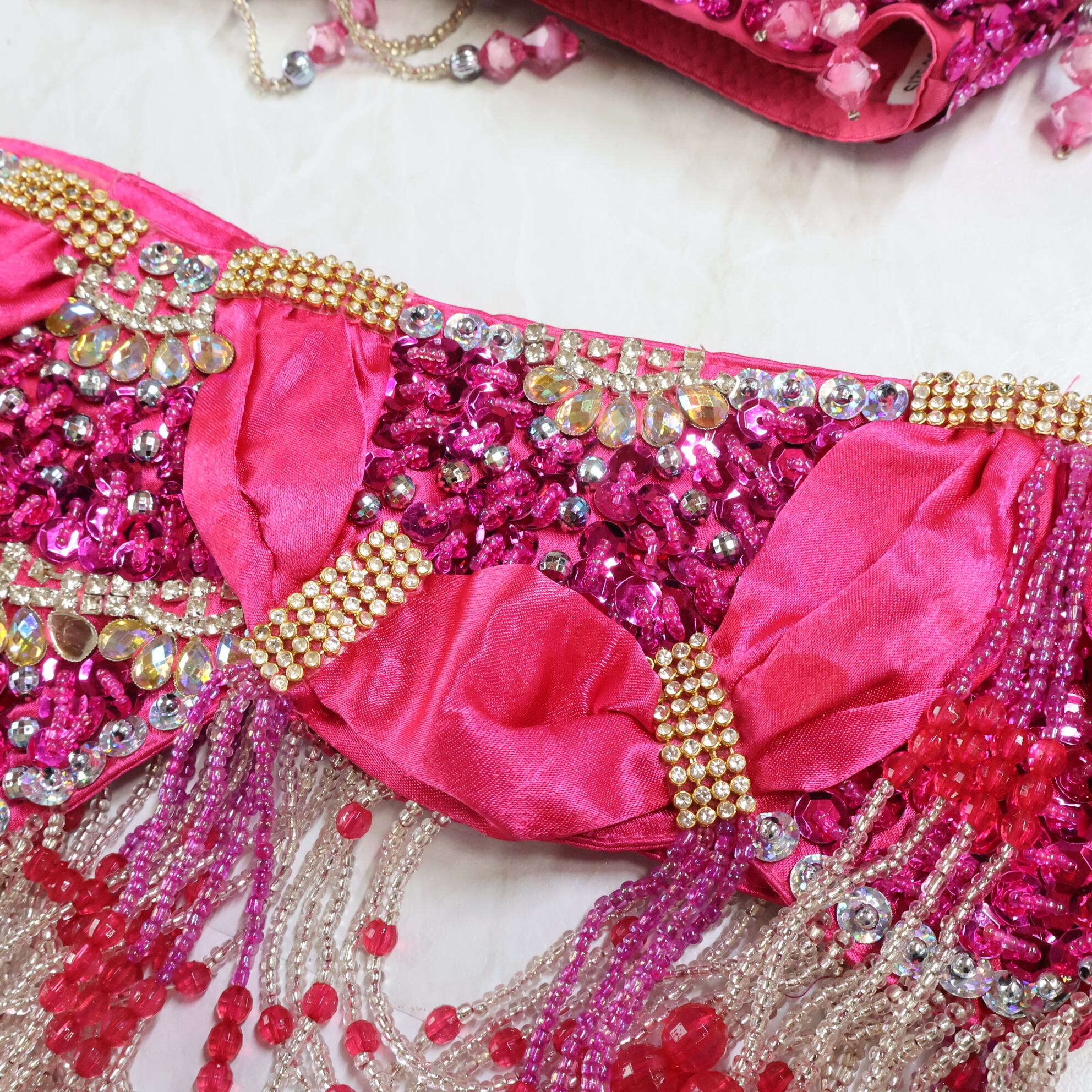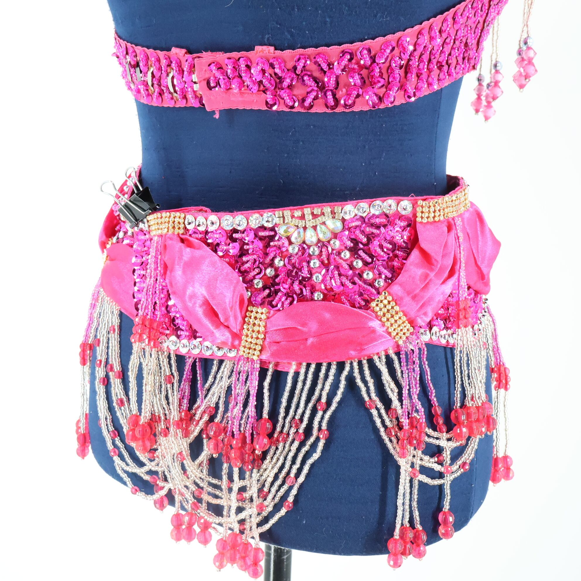 #ダンス衣装 #ダンスコスチューム #ステージ衣装 #古着 #中古 #ENUTSU #ベリーダンス #オリエンタル衣装 #ショッキングピンク #シルバー #スパンコール #ビーズ装飾 #ラメ生地 #煌びやか #ゴージャス #華やか #ブラトップ #ベルトセット #女性らしい #ステージ映え #エレガント