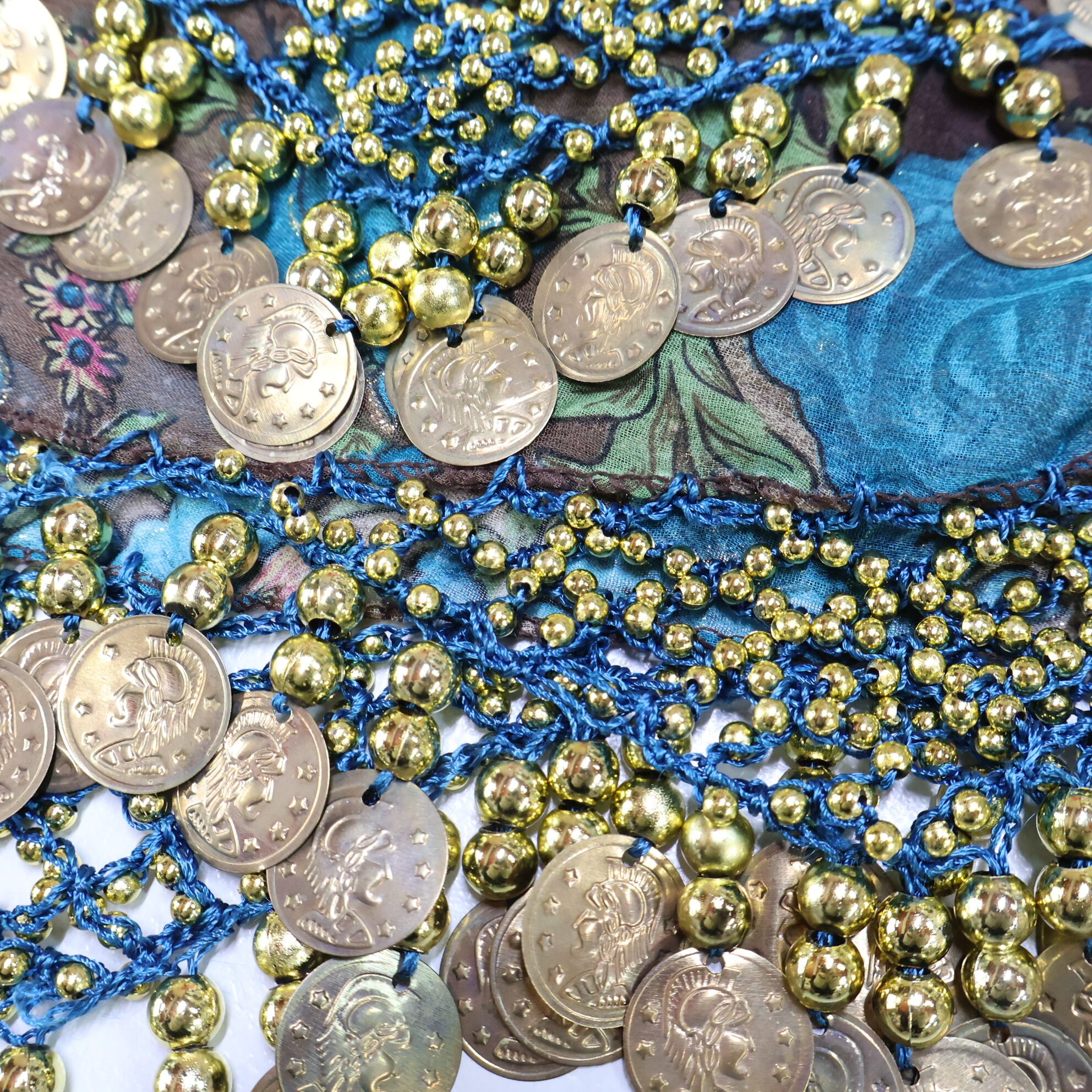 #ダンス衣装 #ダンスコスチューム #ステージ衣装 #古着 #中古 #ENUTSU #ベリーダンス #オリエンタル衣装 #水色 #ブラウン #ゴールドコイン #ビーズ #ラメ #花柄 #レース生地 #リボン付き #華やか #フリルデザイン #チョリ #ベルトセット #エレガント
