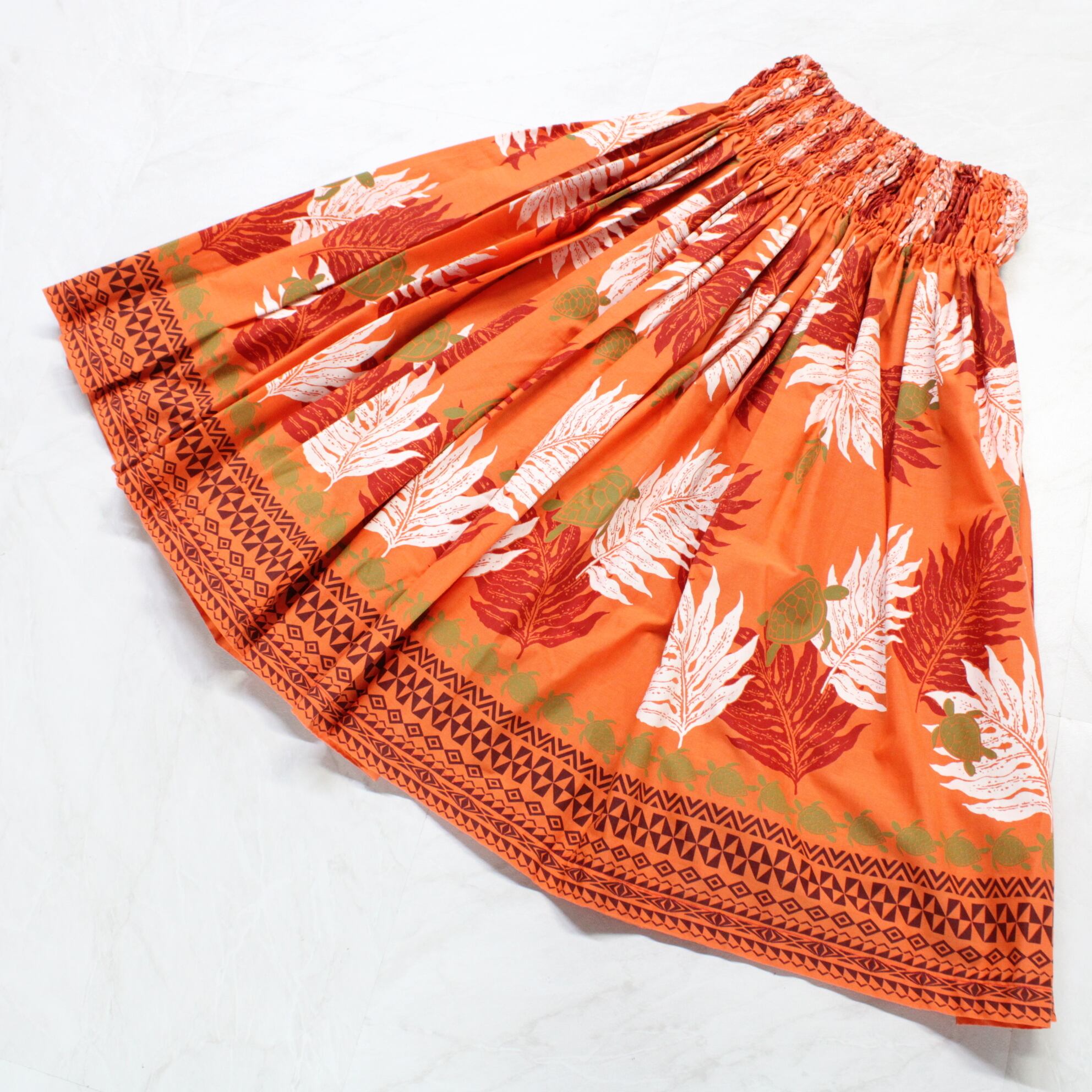 【フラダンス衣装】オレンジ パウスカート ホワイト 白 ホヌ柄 ハワイアンプリント アロハ シャーリング フレア 茶 可愛い 亀