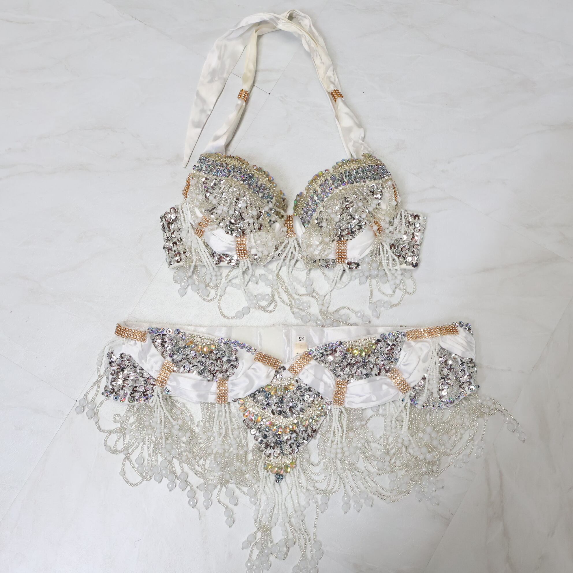 【ベリーダンス用 オリエンタル衣装】ホワイト×シルバー 装飾 豪華 白 ラメ 光沢 煌びやか 輝き 女性らしい 可愛い 2点セット