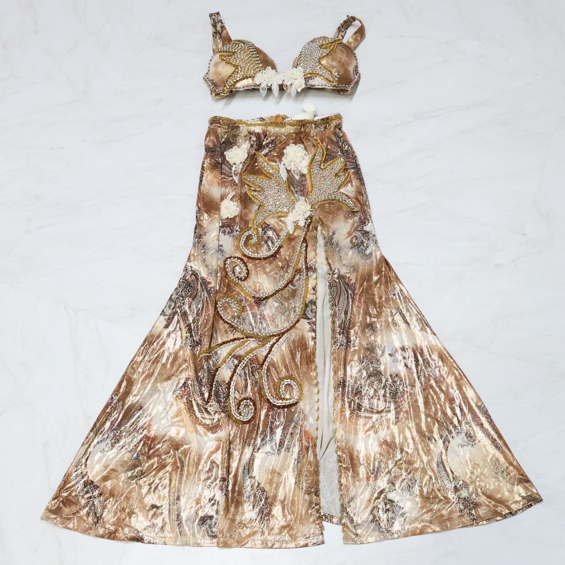 【ベリーダンス用 オリエンタル衣装】ゴールド×ブラウン ラインストーン 花のコスチューム 茶色 ラメ スリット 光沢 煌びやか ブラトップ スカート セット ゴージャス感 シルバー パール