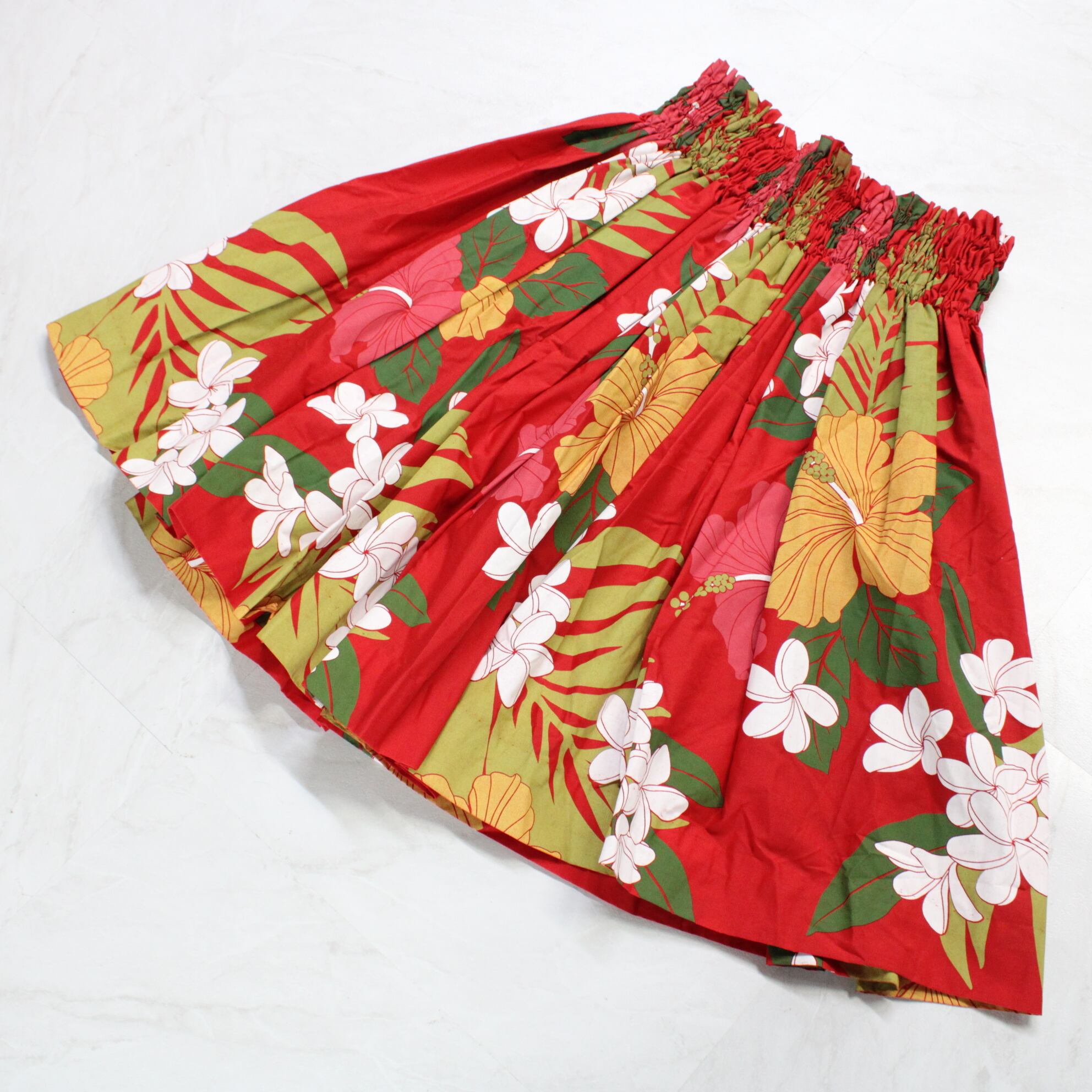 【フラダンス衣装】レッド パウスカート プルメリア柄 ホワイト 赤 白 黄 ハイビスカス柄 花柄 華やか 鮮やか アロハ かわいい