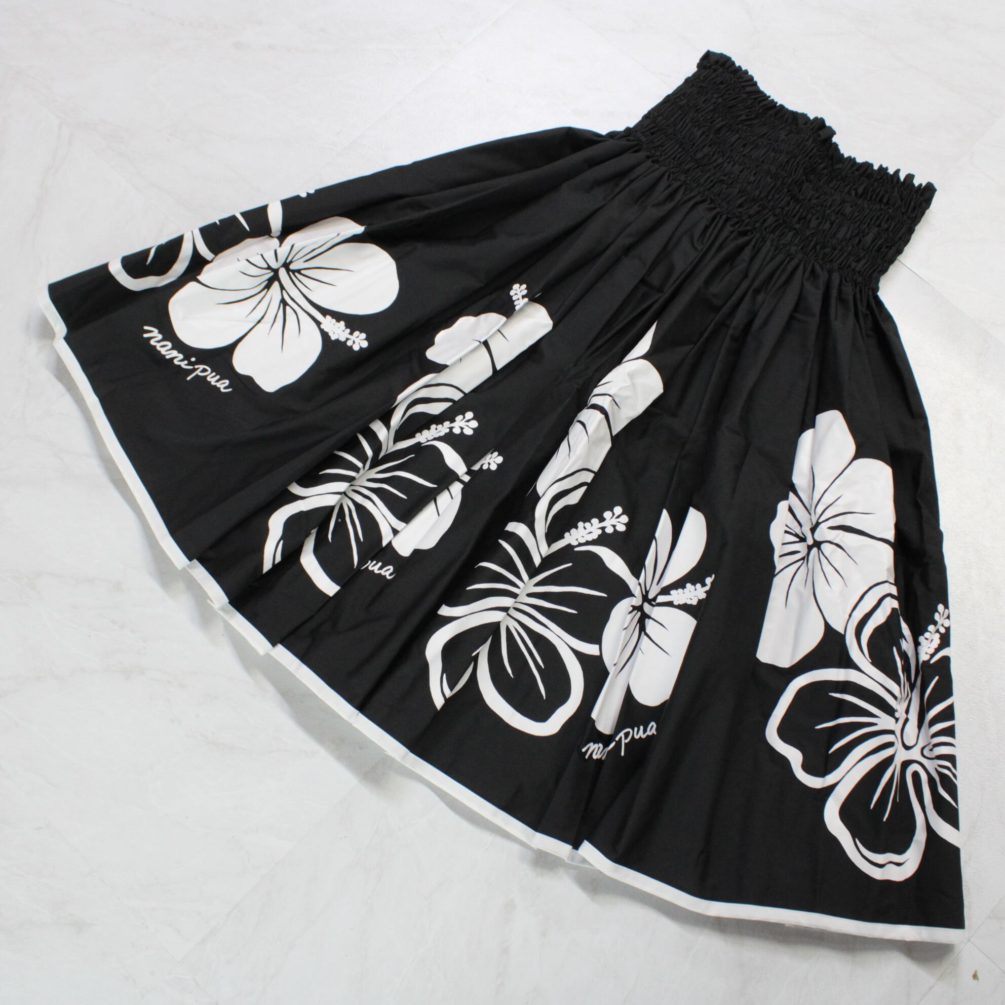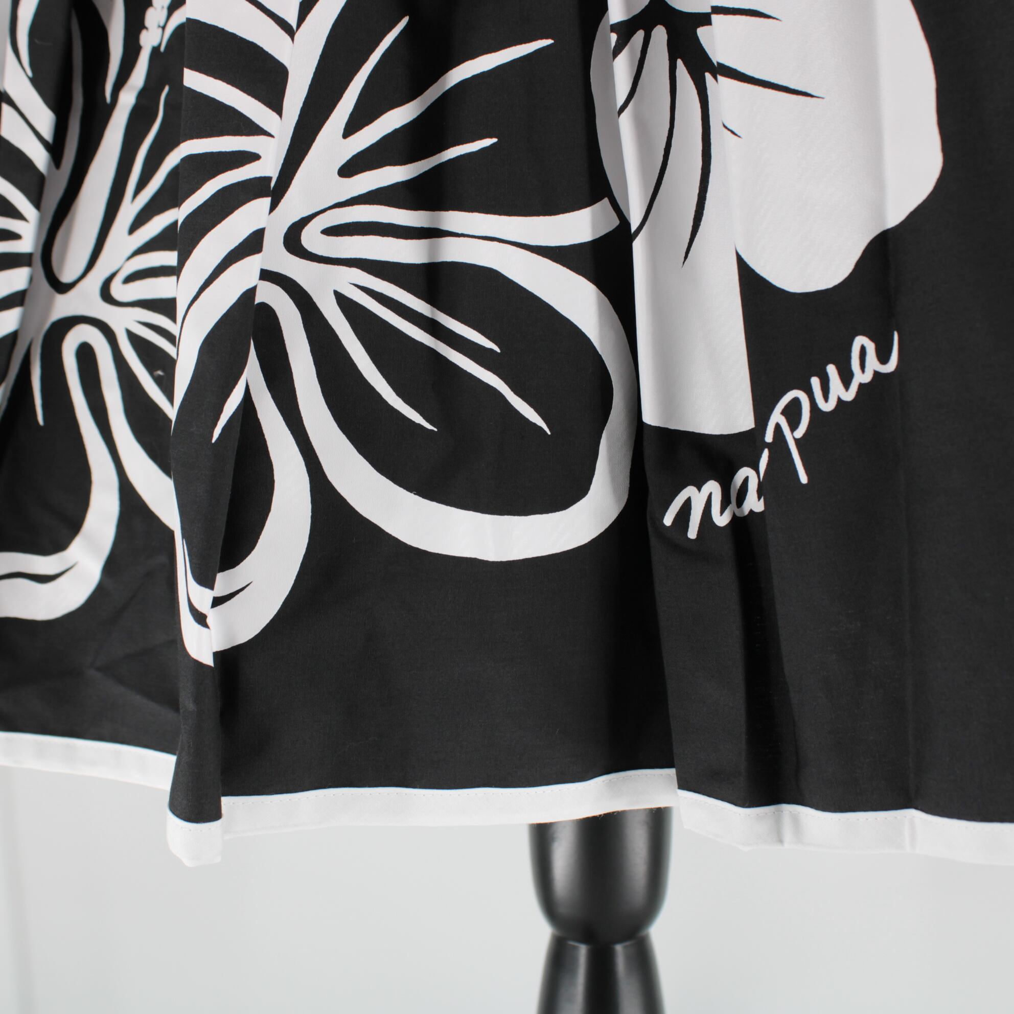 【美品 日本製 フラダンス衣装】ブラック nanipua ナニプア パウスカート ハイビスカス柄 花柄 モノトーン 黒 白 ホワイト 花