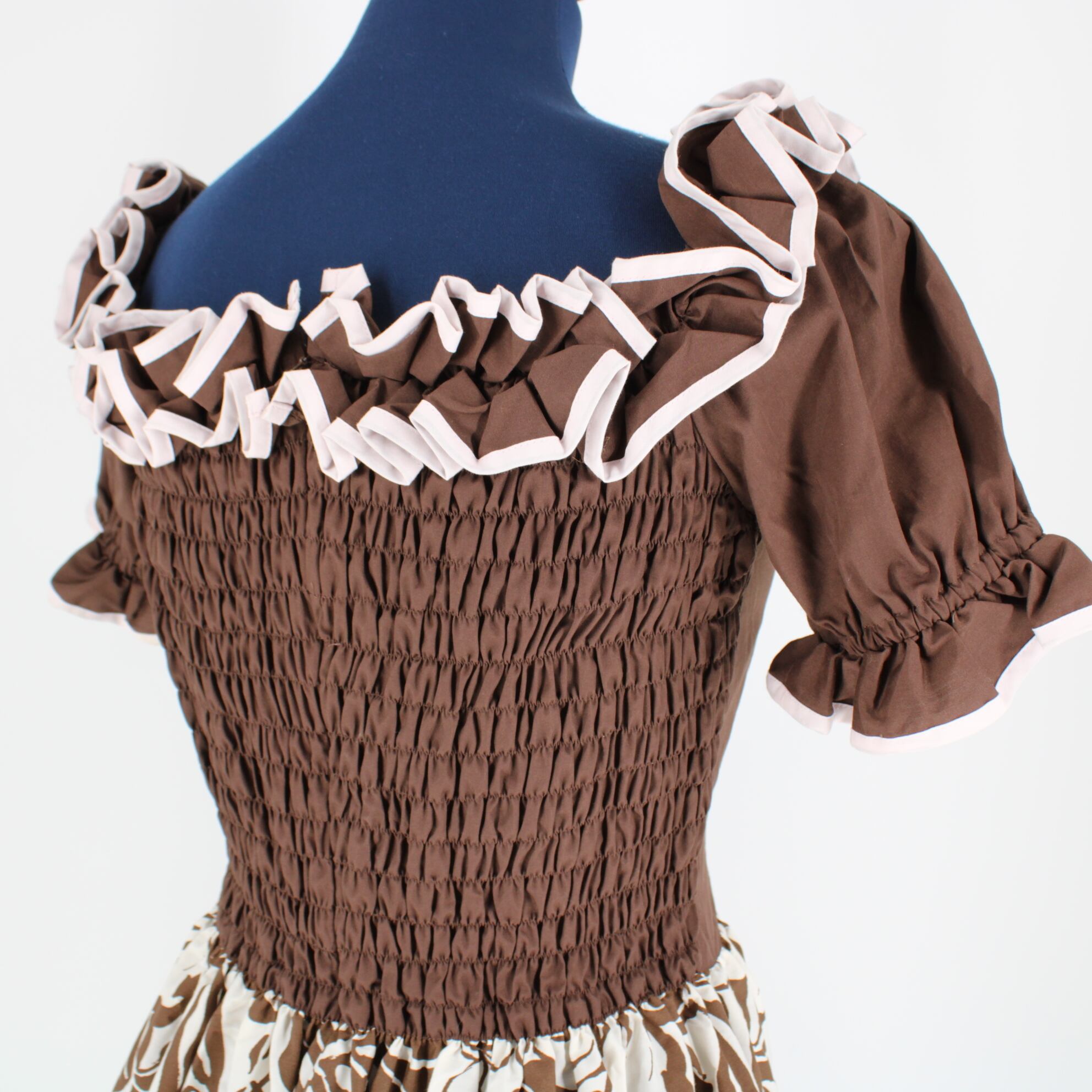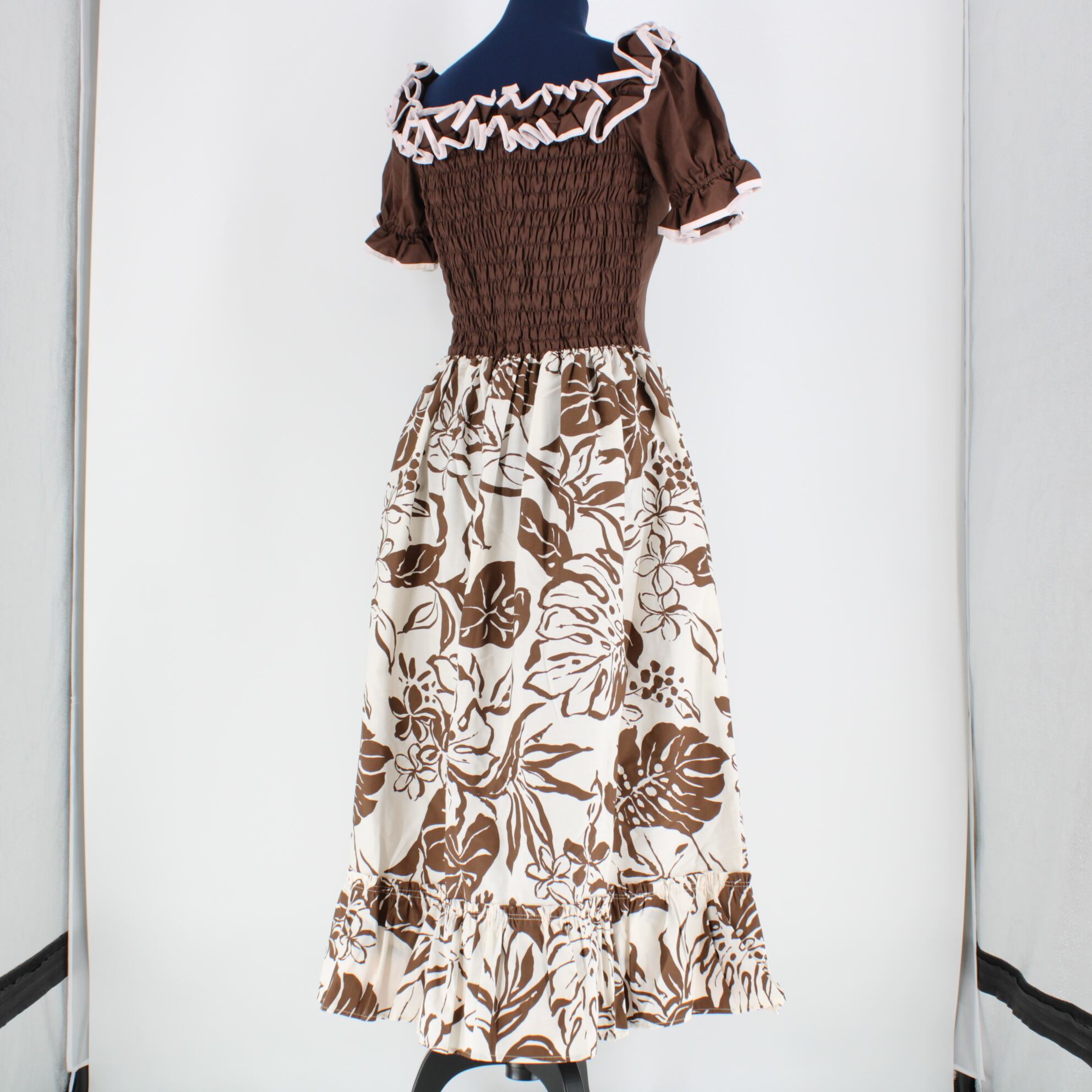 【日本製 フラダンス衣装】ブラウン MermaidLine MMJ マーメイドライン ワンピース ドレス 茶 ピンク 白 フリル 花柄 かわいい