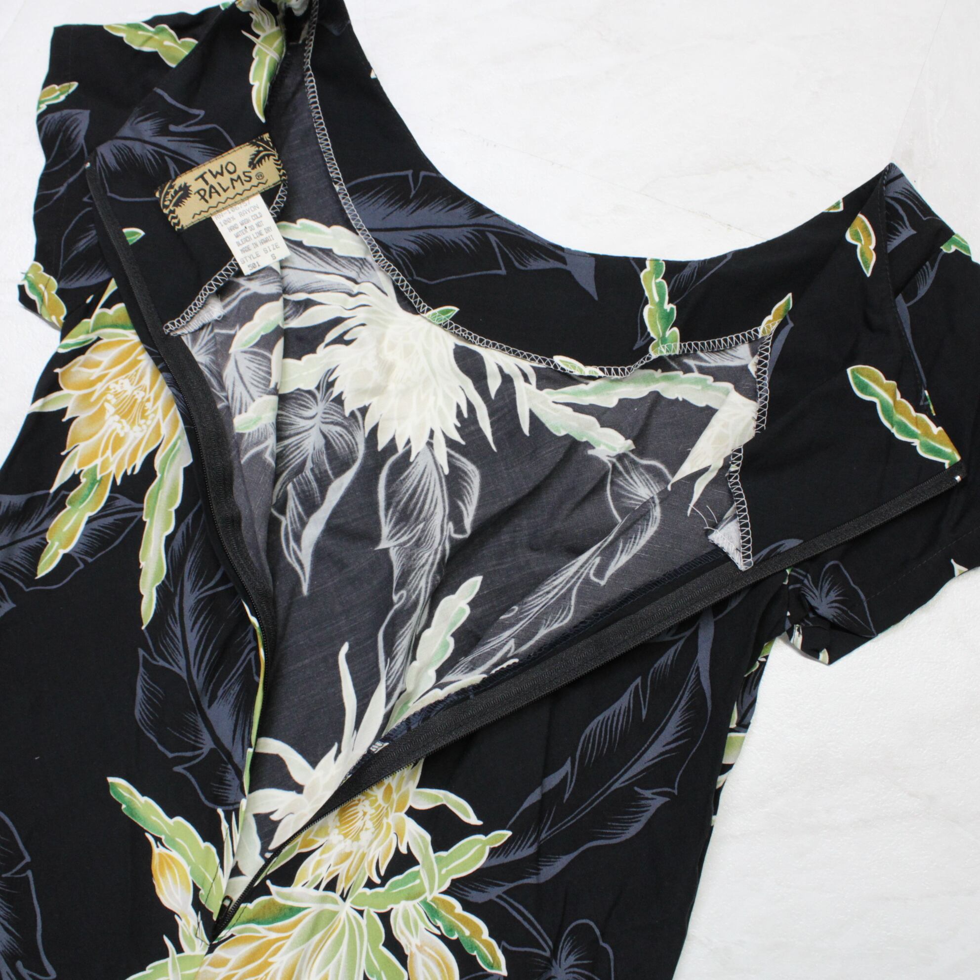 【ハワイ製 フラダンス衣装】ブラック TWO PALMS ワンピース ドレス 花柄 イエロー グリーン 黄 緑 黒 半袖 鮮やか かわいい