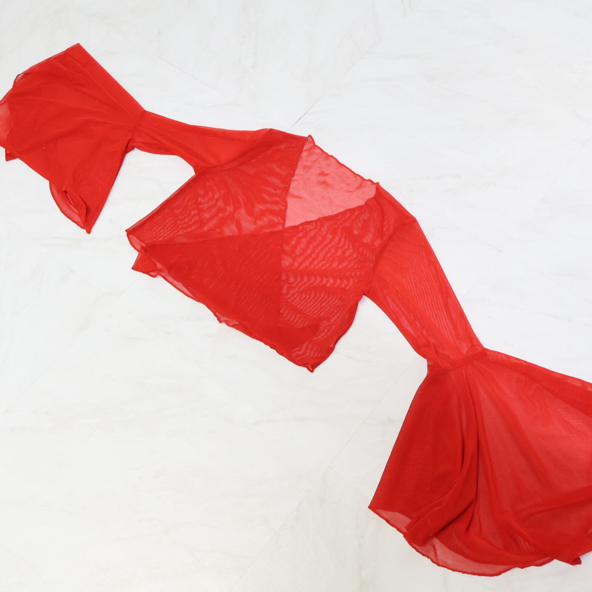 【フラメンコ衣装】レッド ブラウス トップス ボレロ 赤 無地 フレア ラッパ袖 リボン 軽い 薄い 透け感 伸縮 ダンス用 発表会
