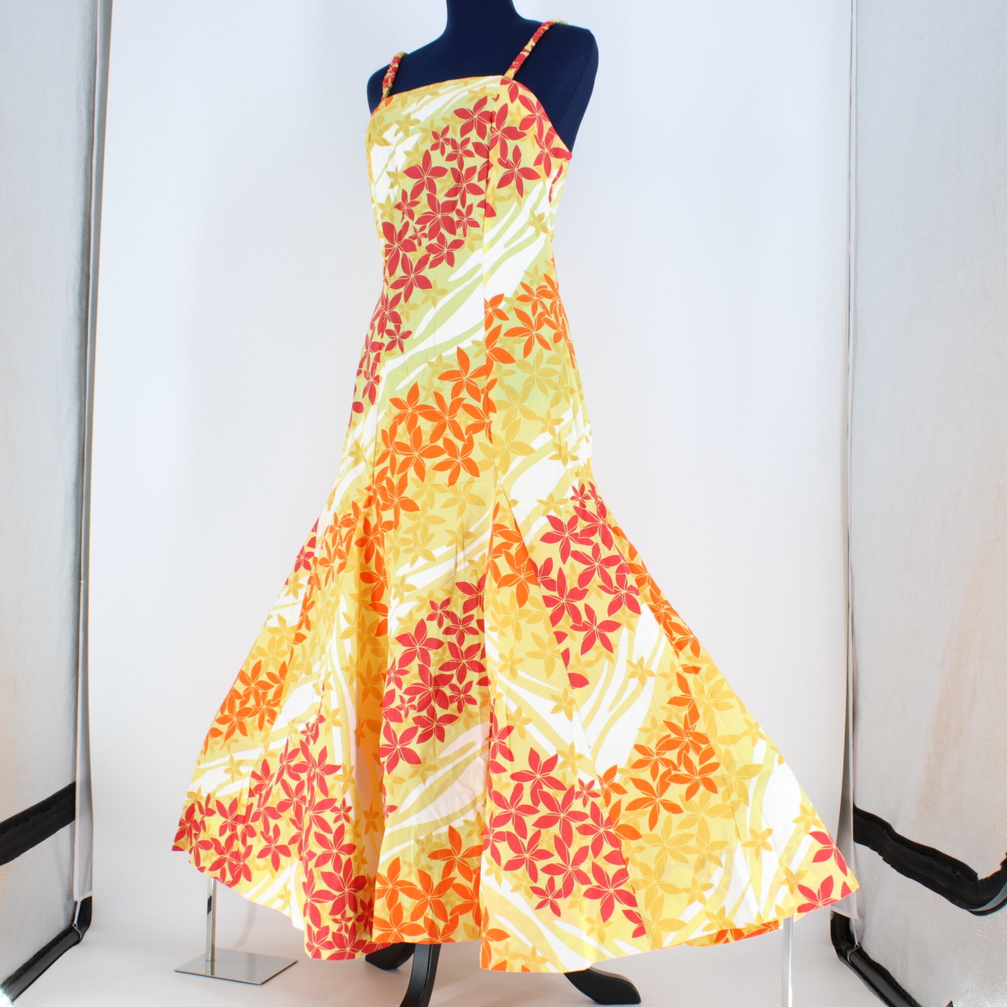 【ハワイ製 フラダンス衣装】イエロー Pukalani Fashion ワンピース ドレス プルメリア柄 黄 キャミソール 花 赤 レッド 花柄