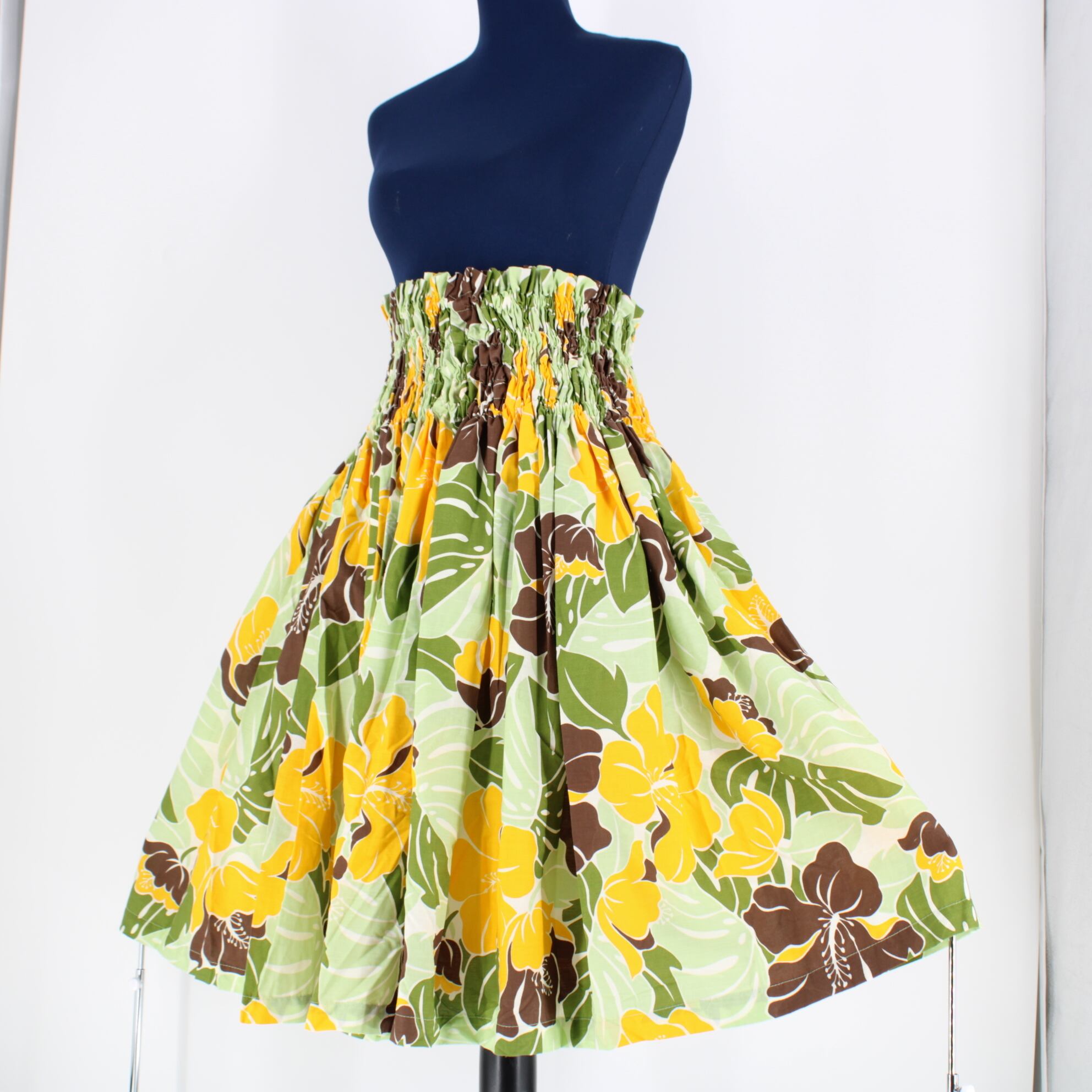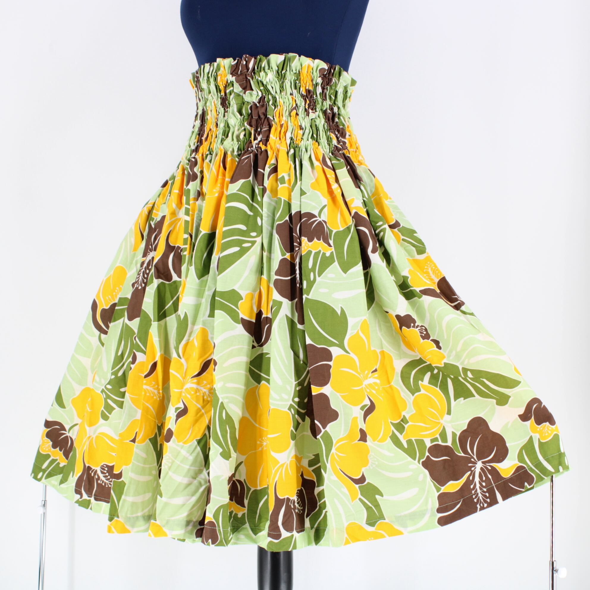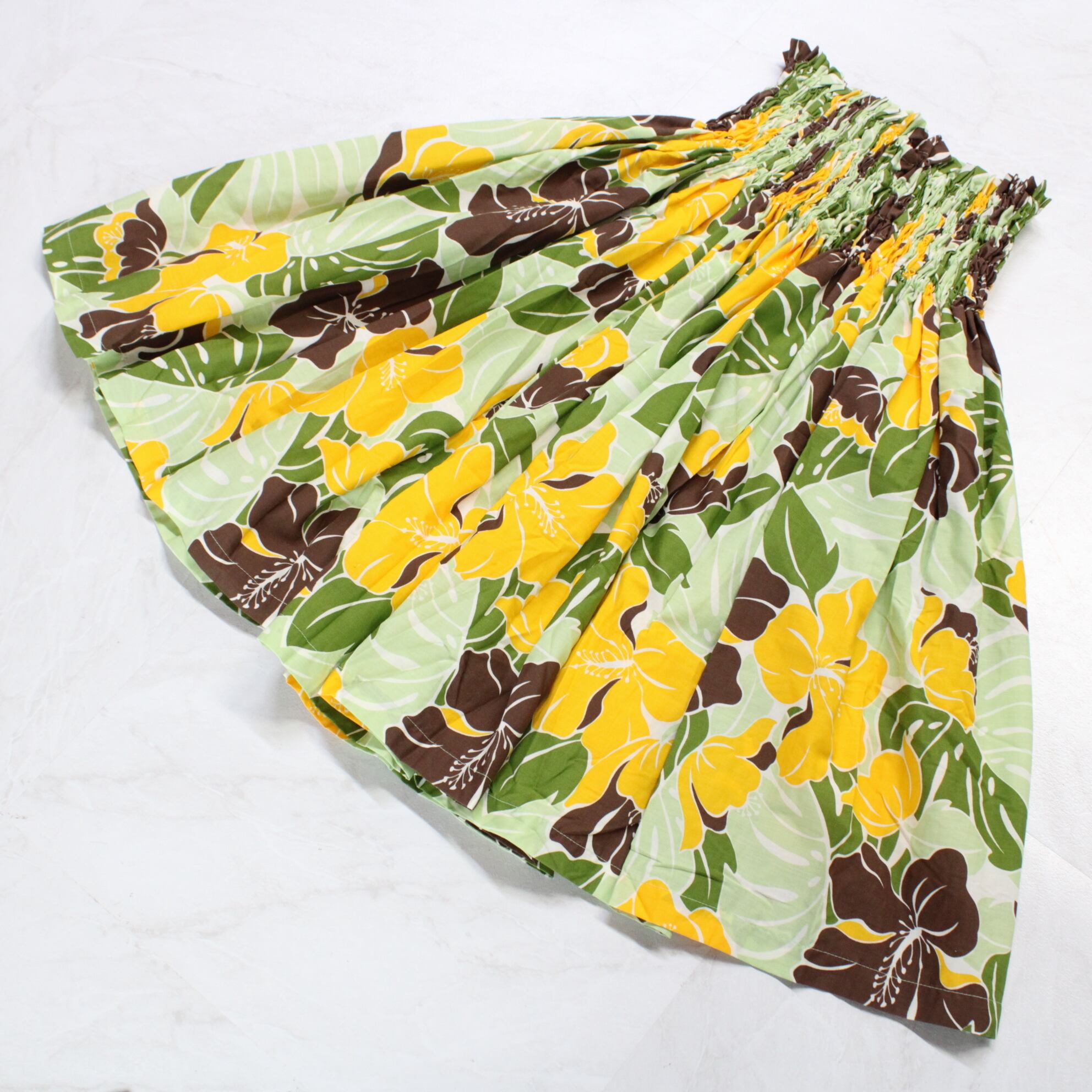 【フラダンス衣装】ライトグリーン パウスカート ハイビスカス柄 モンステラ柄 黄緑 黄 イエロー 茶 ブラウン 花柄 かわいい