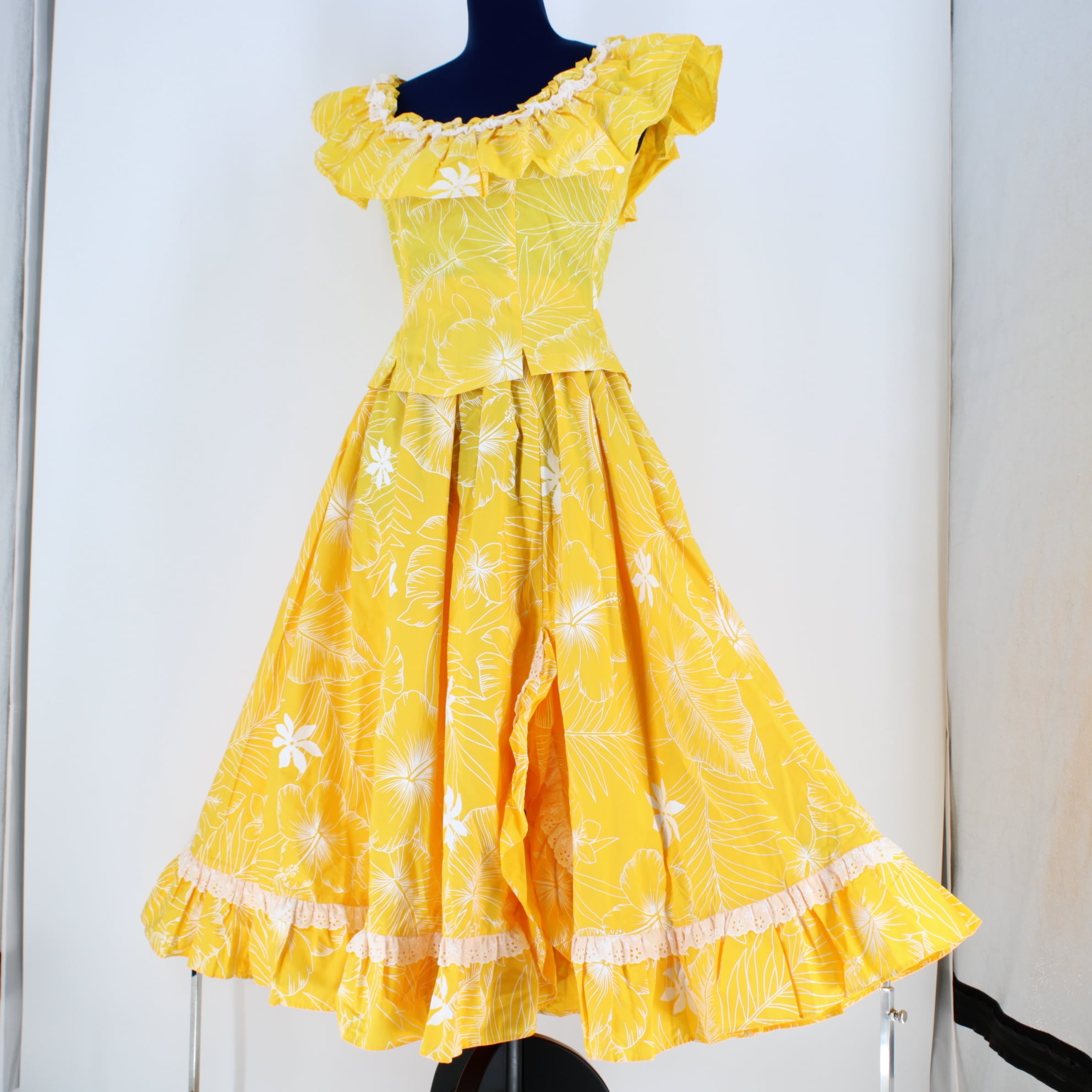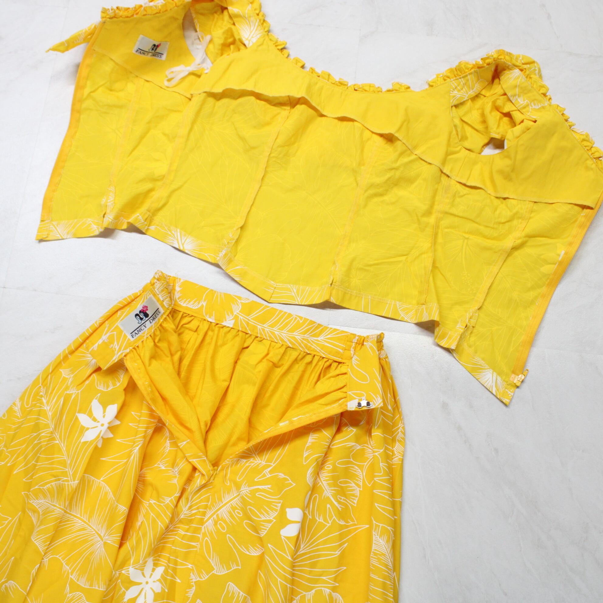 【フラダンス衣装】イエロー FANCY DRESS ファンシードレス 上下セット ツーピース セットアップ ティアレ柄 ホワイト 黄 白