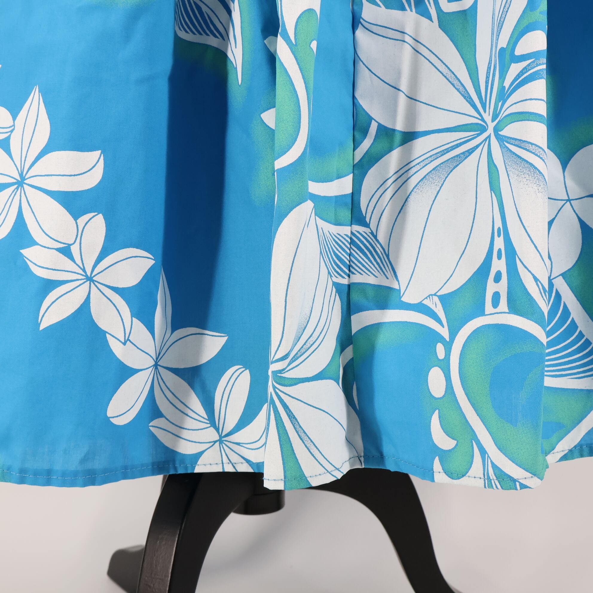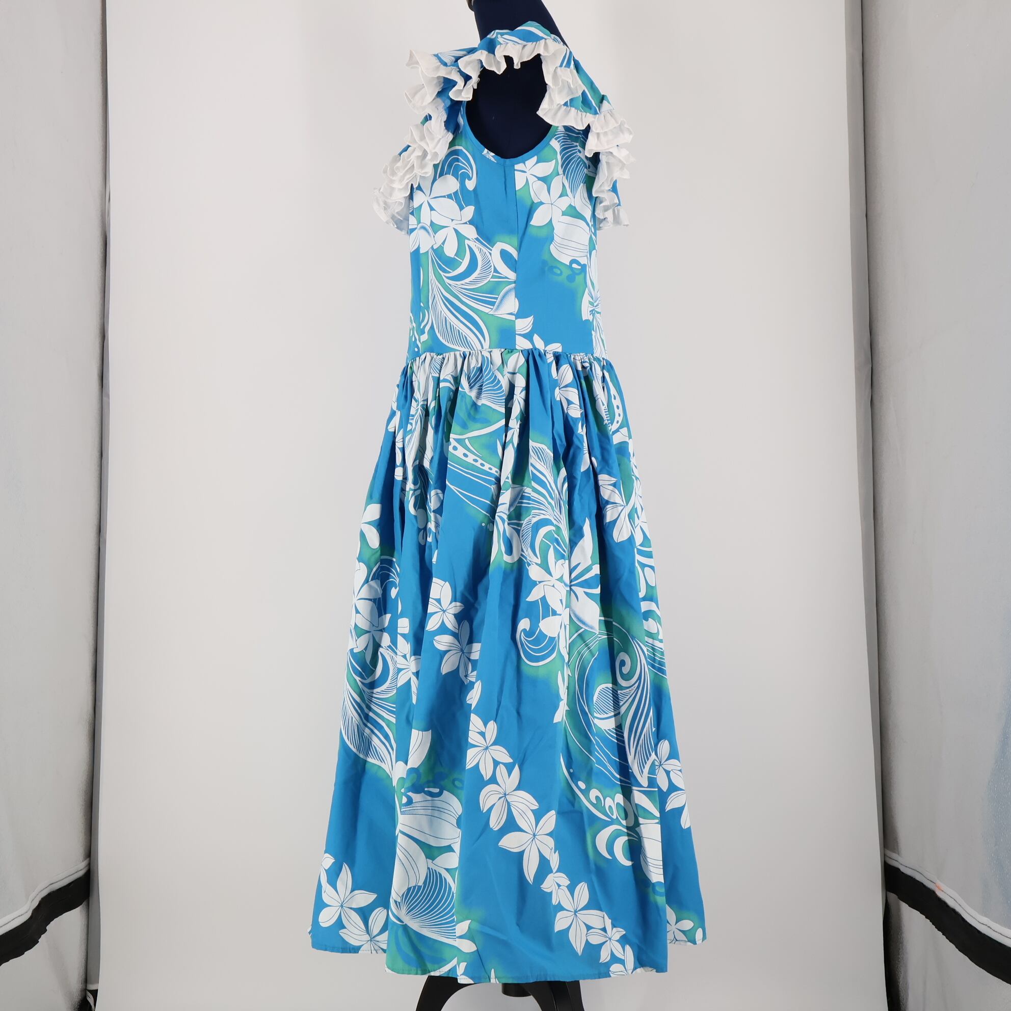 【ハワイ製 フラダンス衣装】スカイブルー Pukalani Fashion ワンピース ドレス フリル プルメリア柄 水色 ホワイト 白 可愛い