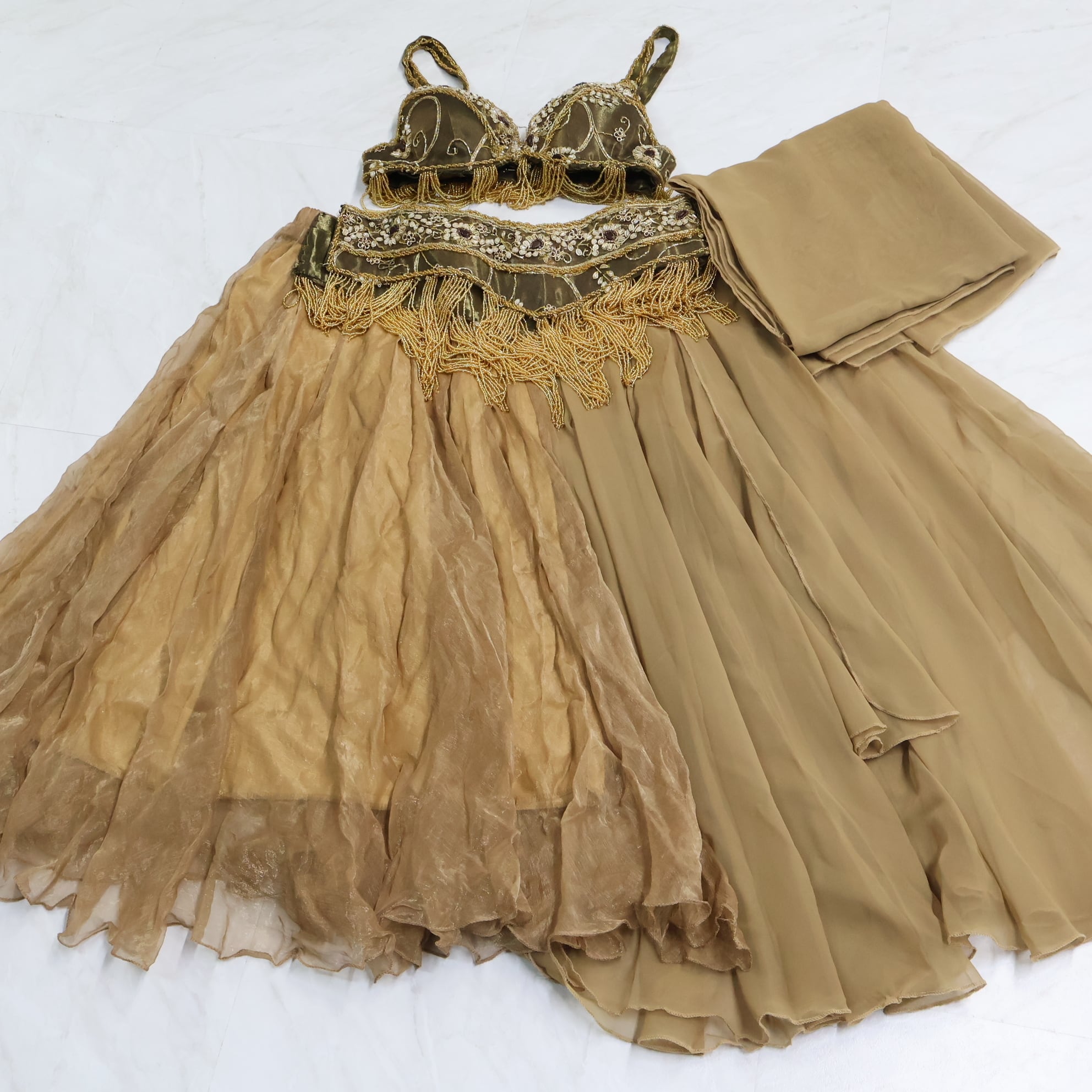 #ベリーダンス #ベリーダンス衣装 #オリエンタル衣装 #ブラウン #カーキー #ビーズ #ゴールド #レース #花柄 #光沢 #華やか #煌びやか #お洒落 #トップス #ベルト #スカート #スカーフ #セットアップ #ダンス衣装 #ダンスコスチューム #ステージ衣装 #古着 #中古 #ENUTSU