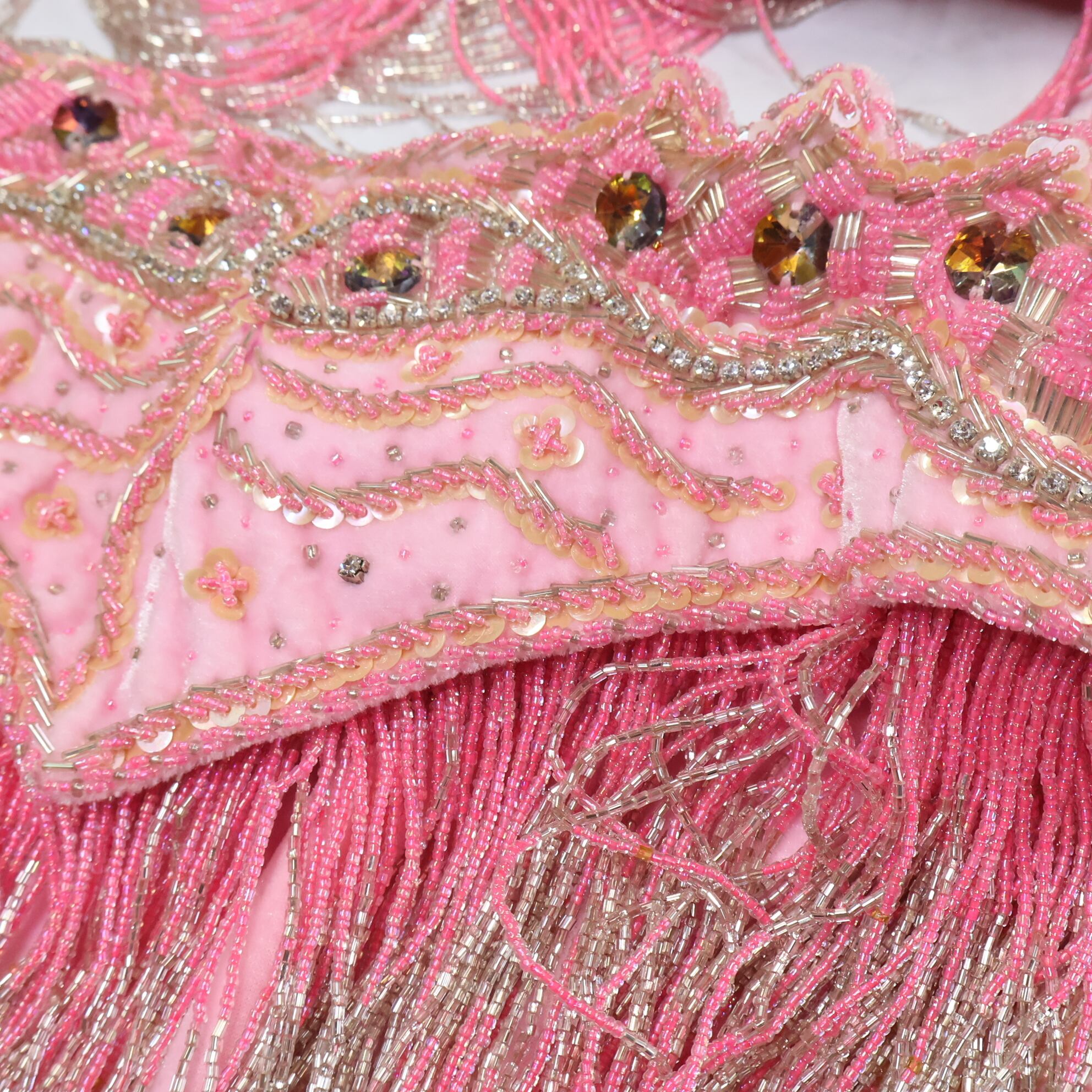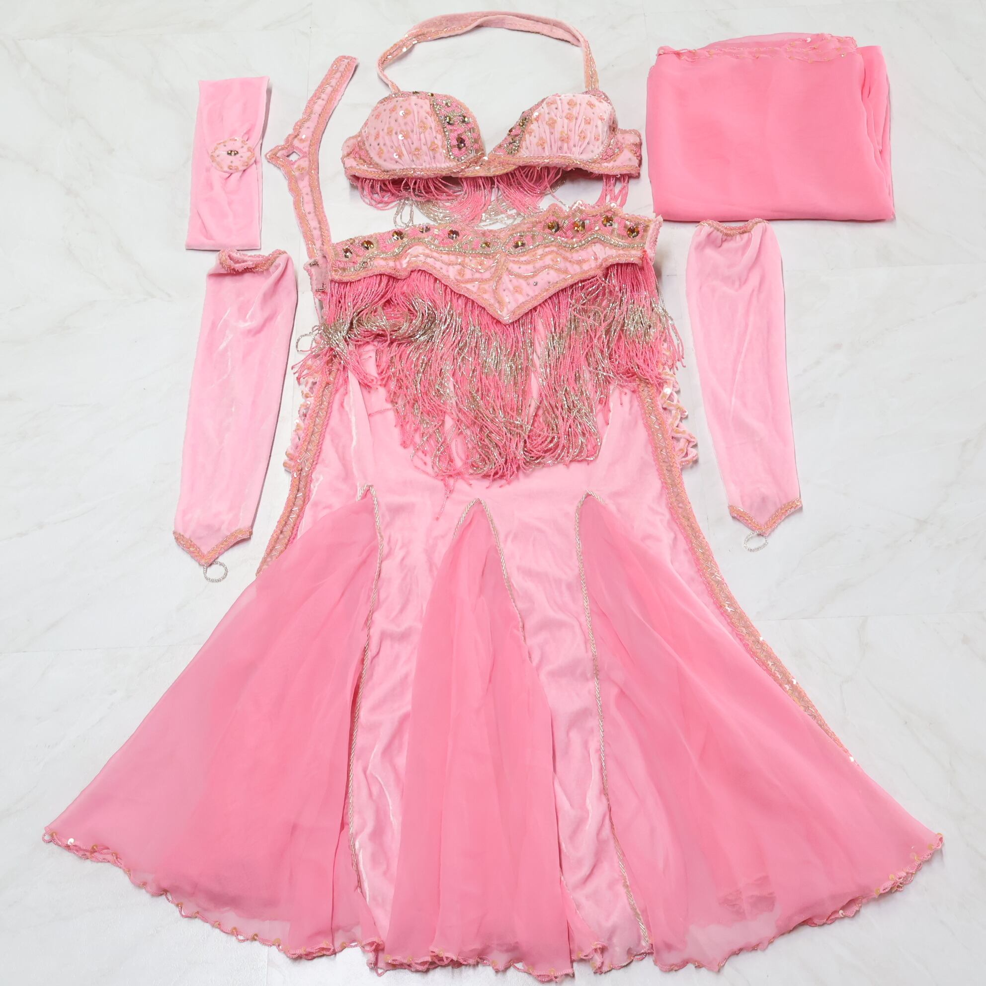 #ベリーダンス #ベリーダンス衣装 #オリエンタル衣装 #薄ピンク #ラインストーン #ビーズ #レース #ベロア #スリット #女性らしい #華やか #可愛い #トップス #ベルト #スカート #アクセサリーセット #煌びやか #ゴージャス #ダンス衣装 #ダンスコスチューム #ステージ衣装 #古着 #中古 #ENUTSU