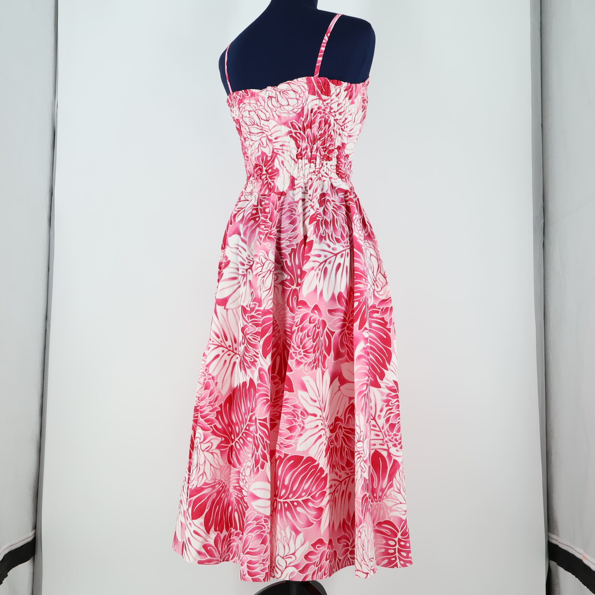 【フラダンス衣装】ホワイト ワンピース ドレス ピンク 白 キャミソール 袖なし モンステラ柄 華やか 鮮やか アロハ かわいい