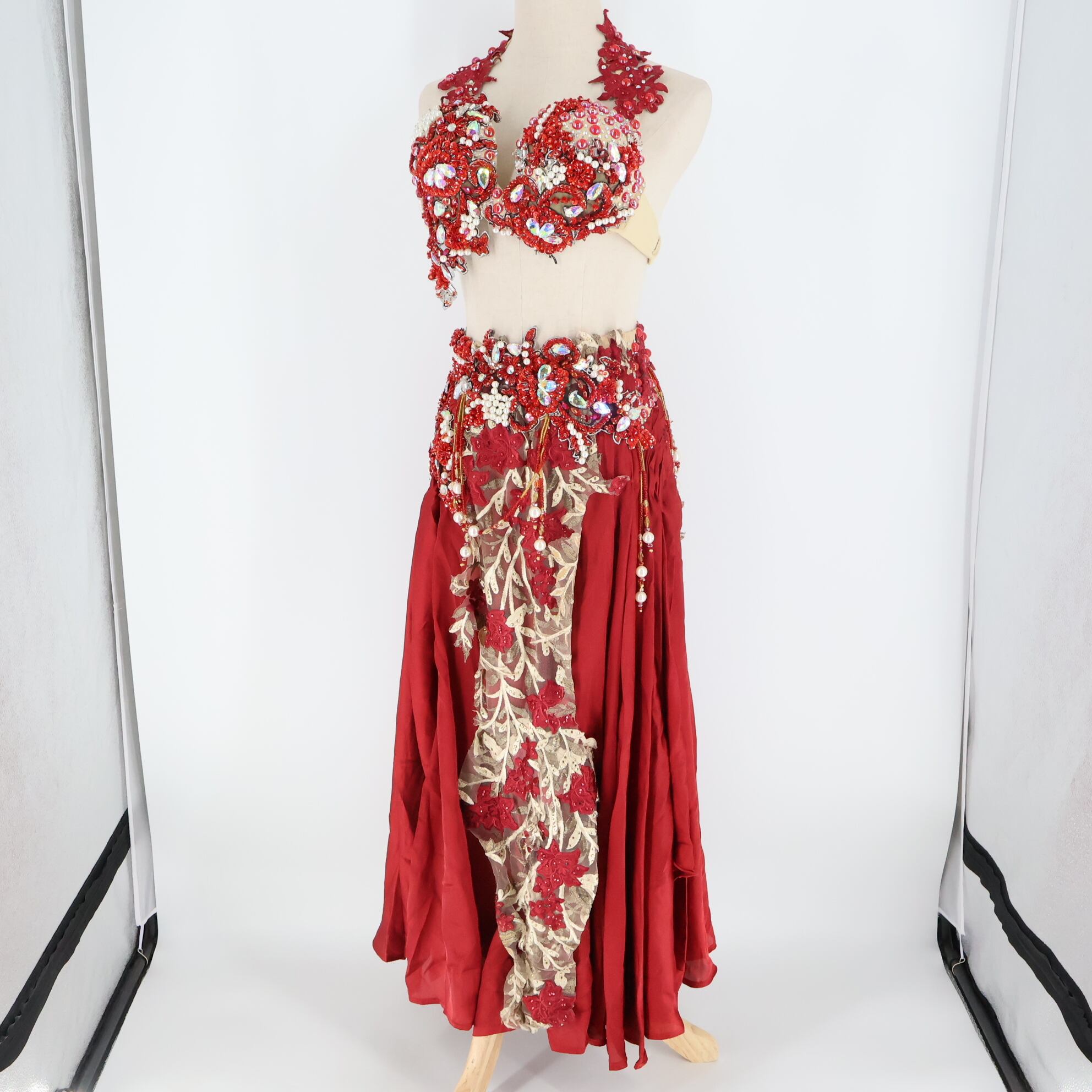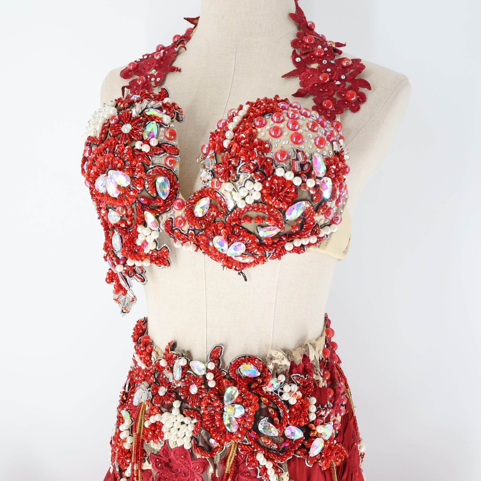 【エジプト製 ベリーダンス用オリエンタル衣装】レッド Queen 装飾豪華 赤 白 レース スリット パール ラメ 花柄 煌びやか 鮮やか お洒落 ビーズ ラインストーン スパンコールラメ トップス スカート セット インナーショーツ付き