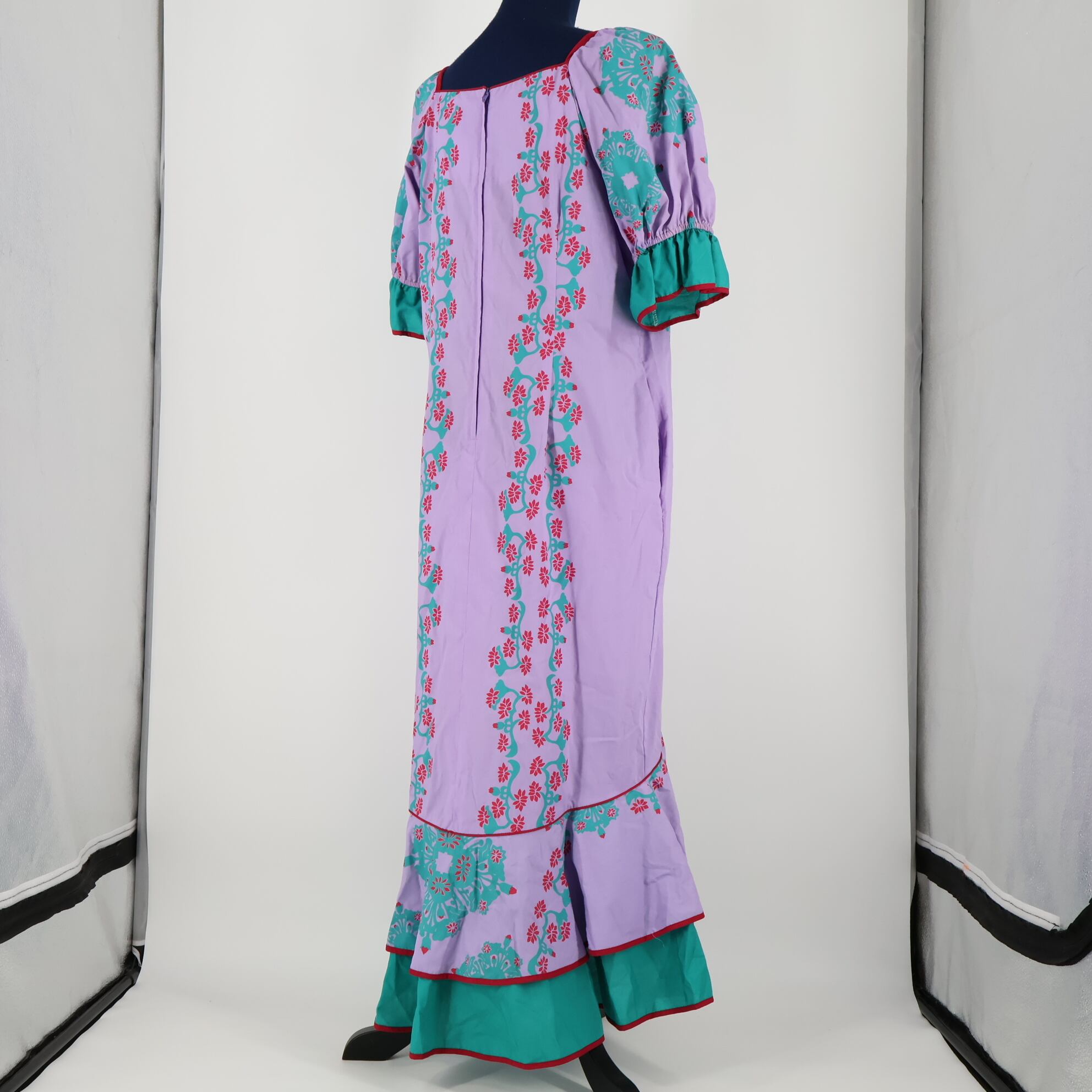 #フラダンス #ワンピースドレス #パープル #グリーン #フリル #花柄 #ハワイアンプリント #華やか #可愛い #フラガール #アロハファッション #フラ衣装 #リゾートコーデ #タヒチアン #南国スタイル #ダンス衣装 #ダンスコスチューム #ステージ衣装 #古着 #中古 #ENUTSU
