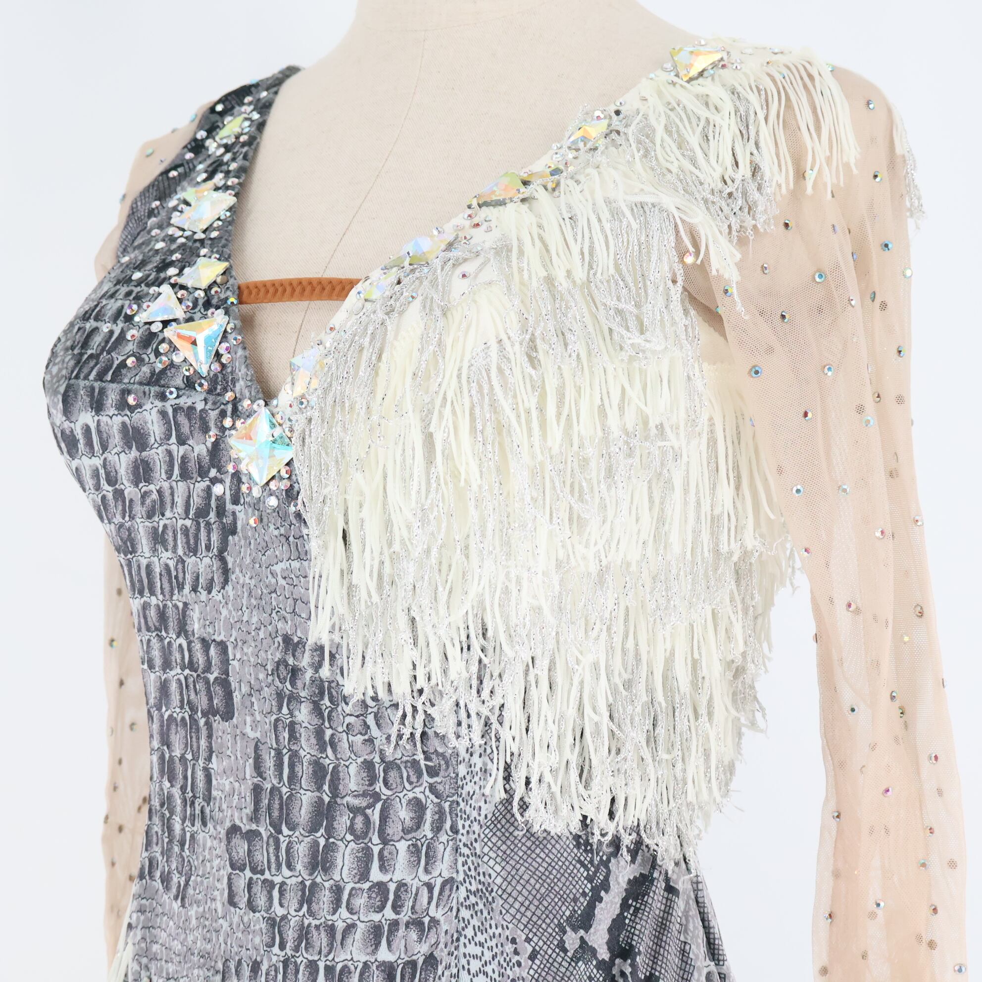【社交ダンス衣装】グレー ラテン ドレス ワンピース クロコダイル フリンジ 白 アイボリー 長袖 黒 灰色 アニマル