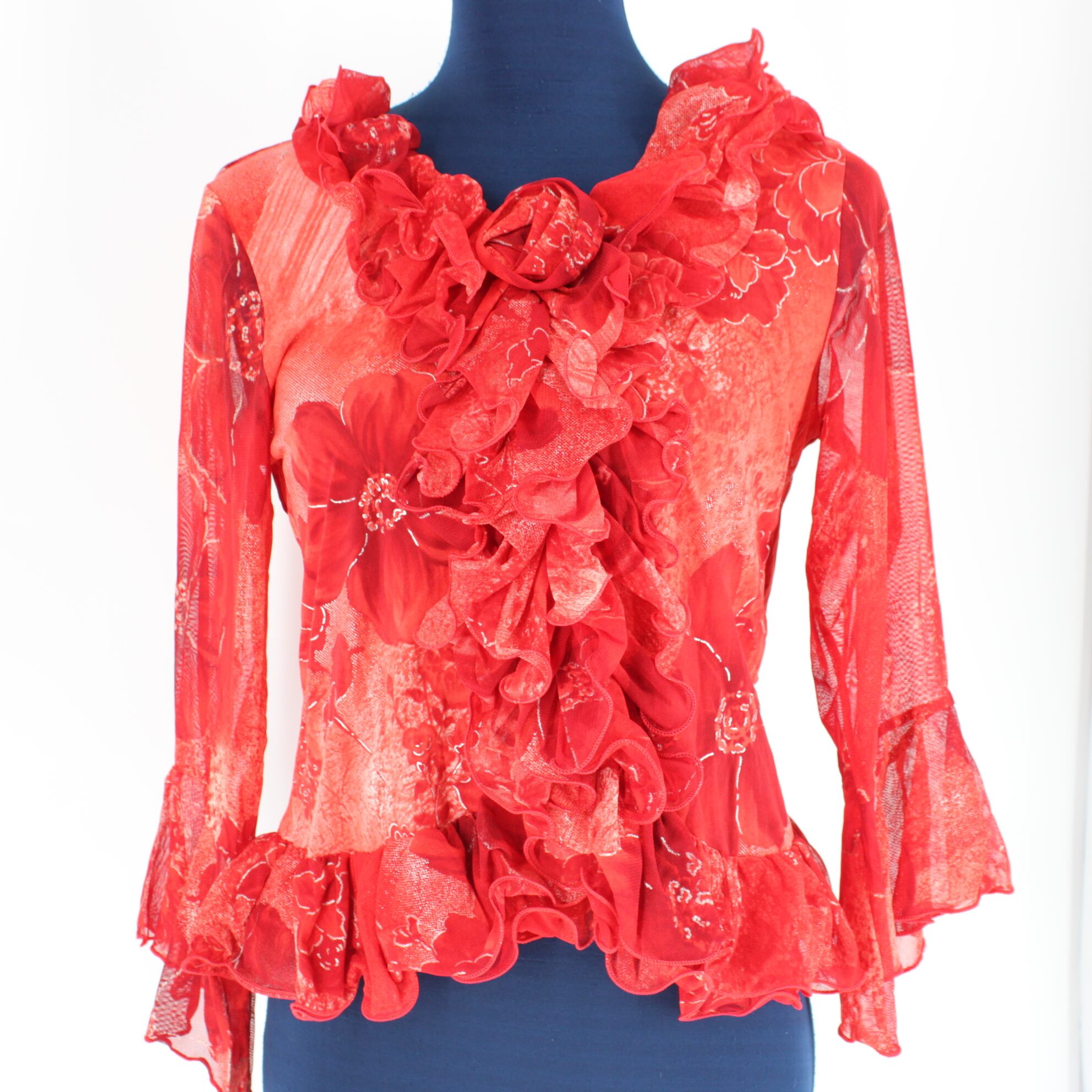 【美品 社交ダンス衣装】トップス ACROSS 赤 レッド 花柄 派手 華やか ゴージャス エレガント かわいい 可愛い フリル 上品