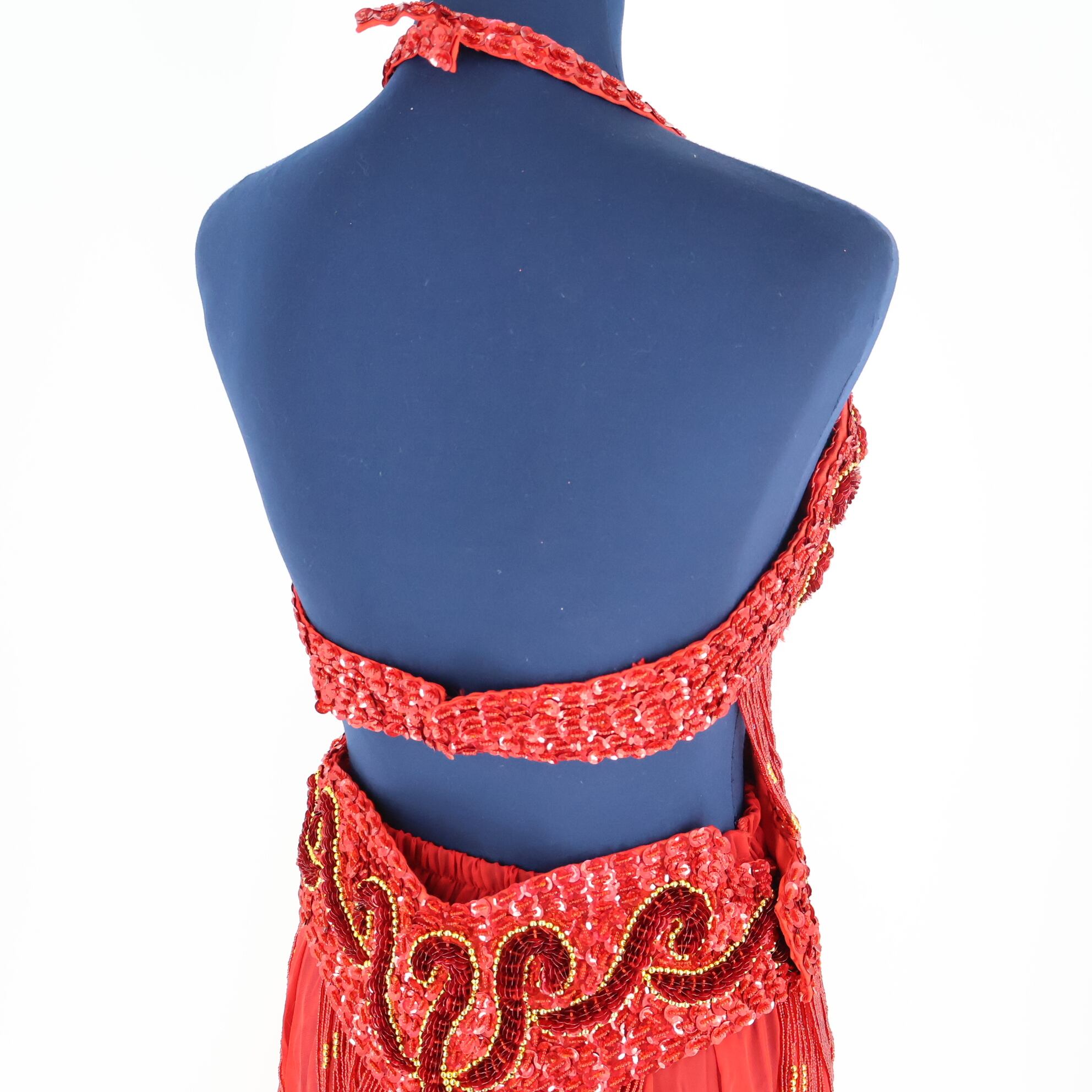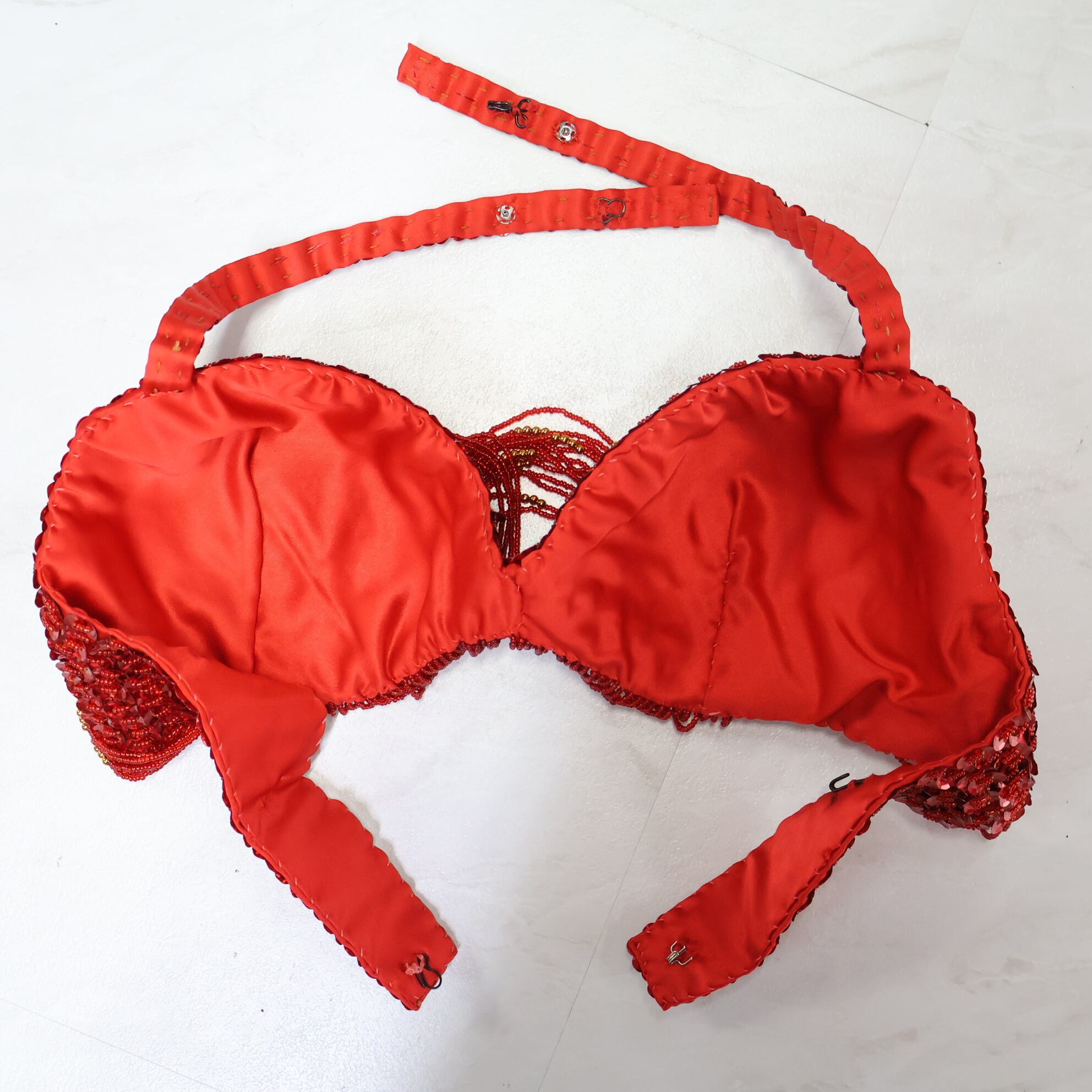 【ベリーダンス用 オリエンタル衣装】レッド スパンコールラメ×ビーズ 真っ赤 ゴールド レース スリット 煌びやか 鮮やか 明るい 輝き 豪華 ラメ トップス ベルト スカート アクセサリー セット