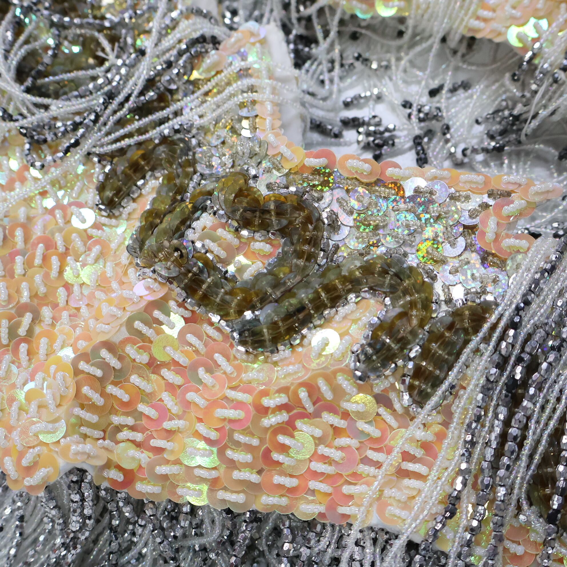【ベリーダンス用 オリエンタル衣装】ホワイト×アイボリー ビーズ×スパンコールラメ 白 ベージュシルバー レース 透け感 綺麗 爽やか 豪華 ふんわり感 スリット トップス ベルト スカート アクセサリー セット
