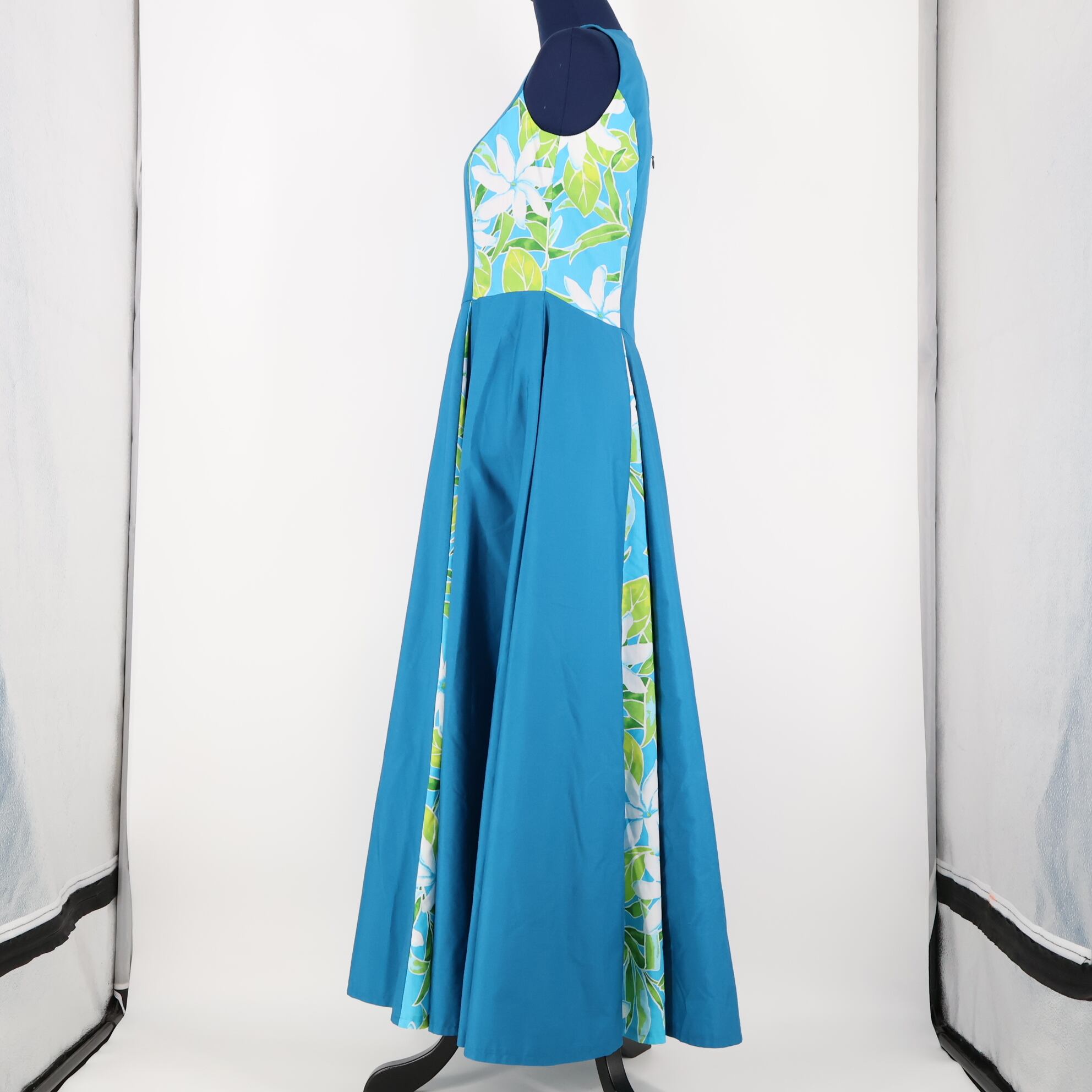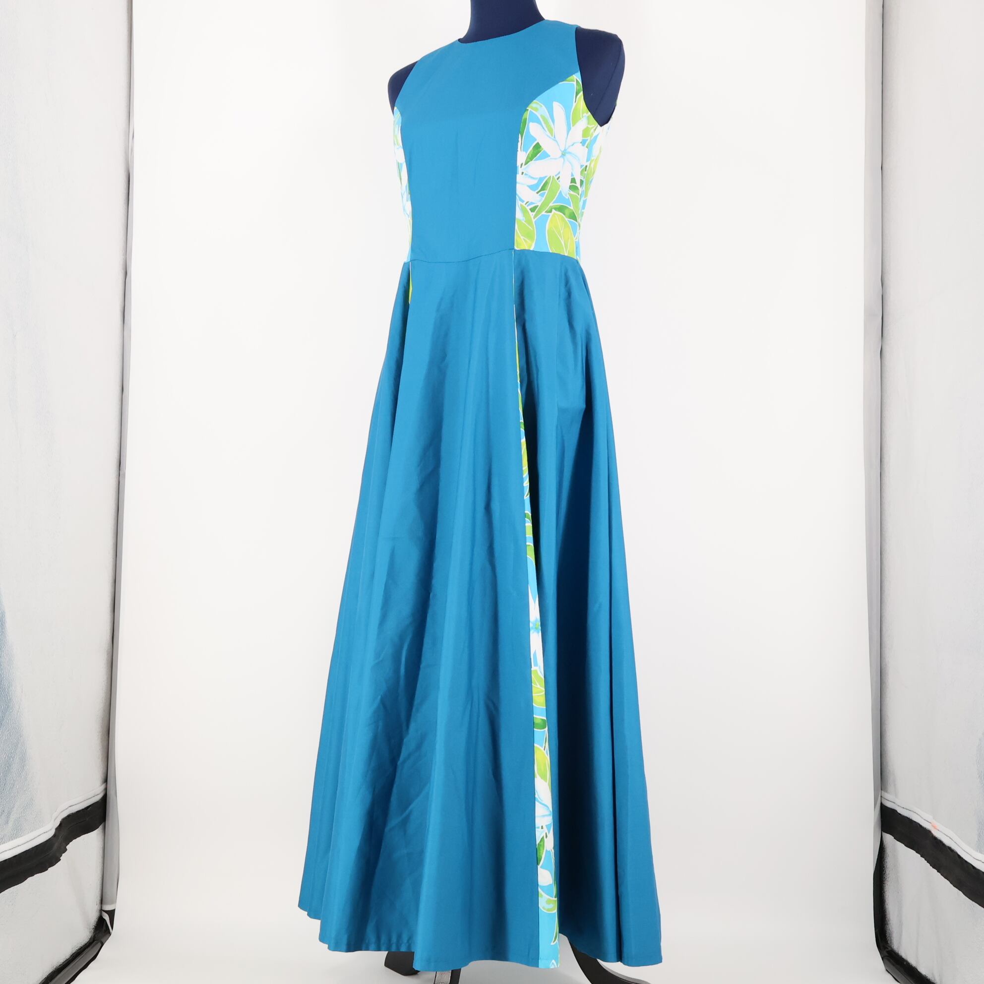 【美品 日本製 フラダンス衣装】スカイブルー EKOLU EHIKU エコルエヒク ワンピース ドレス ティアレ柄 水色 白 緑 爽やか 花